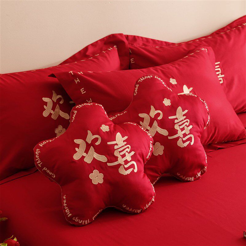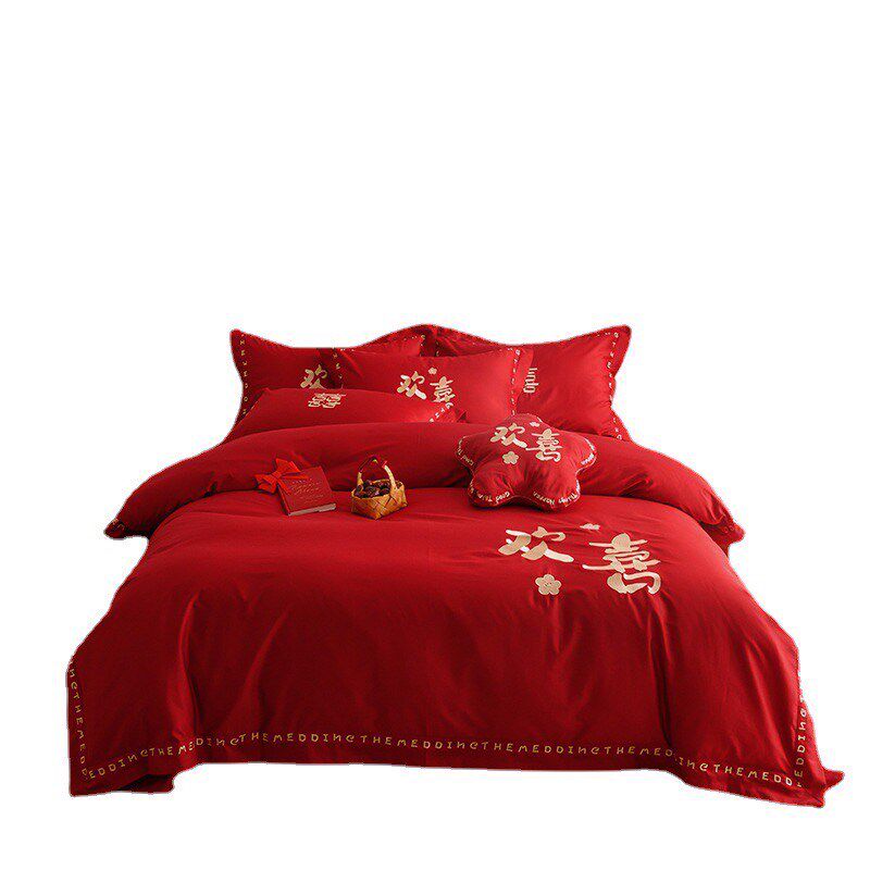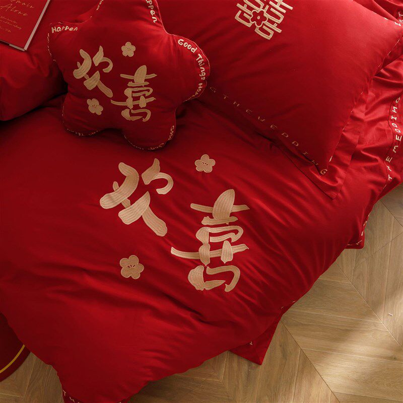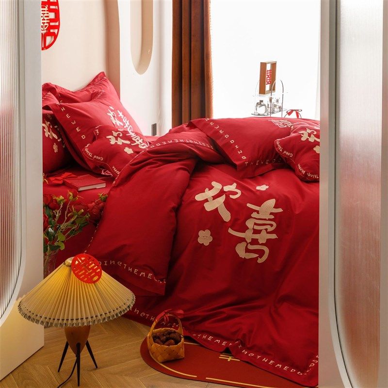 结婚床品全棉婚庆四件套陪嫁妆被套纯棉H红色床单婚嫁喜被床上用