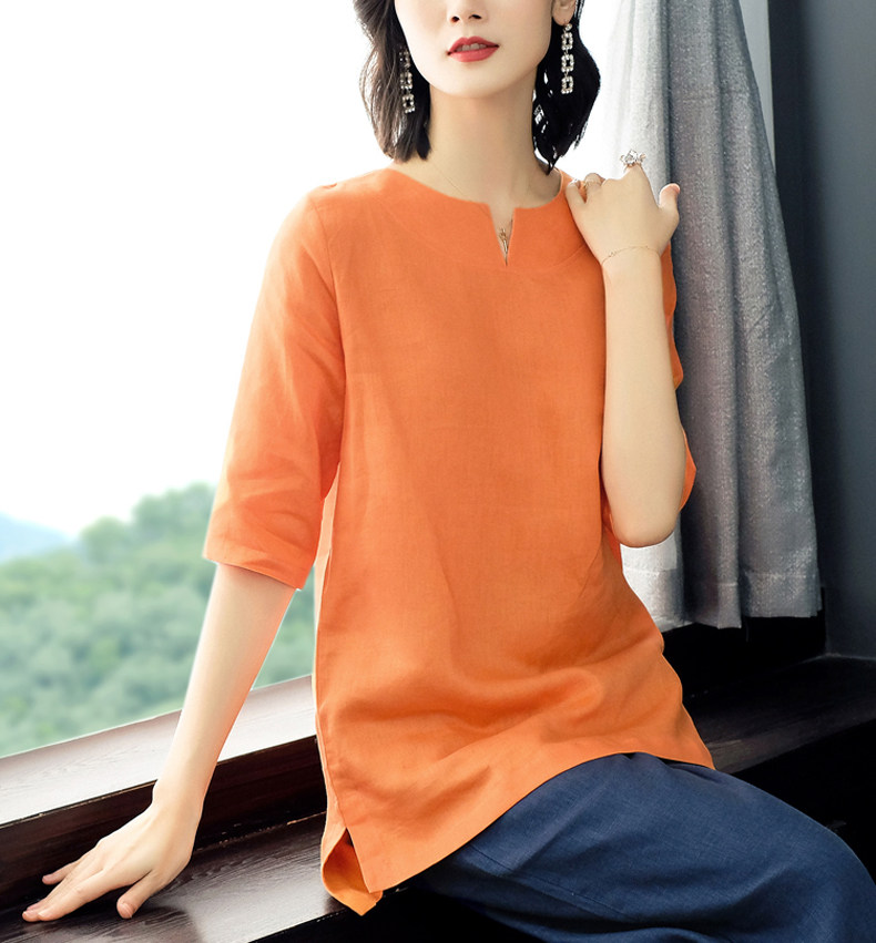 2025夏季新款旅行文艺亚麻百搭上衣女宽松中长款棉麻麻料纯色T恤
