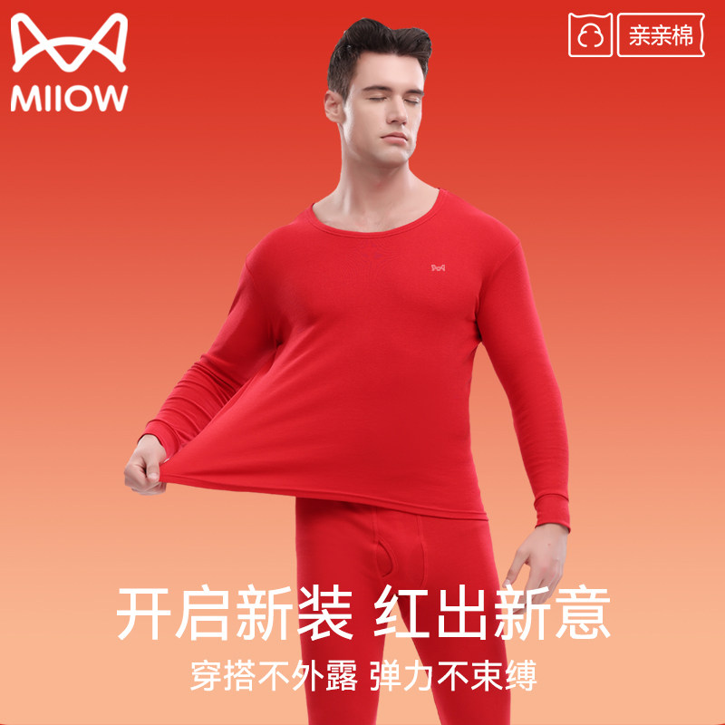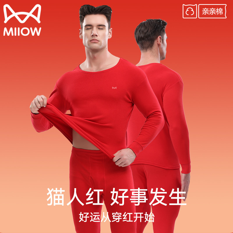猫人情侣新婚本命年大红纯棉秋衣秋裤加肥大码男女保暖打底套装