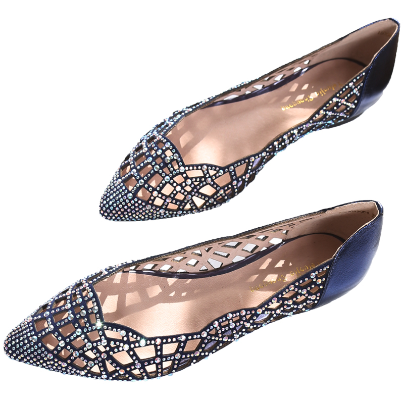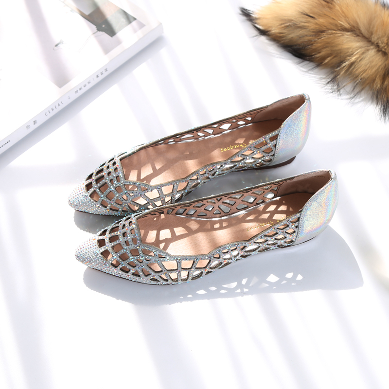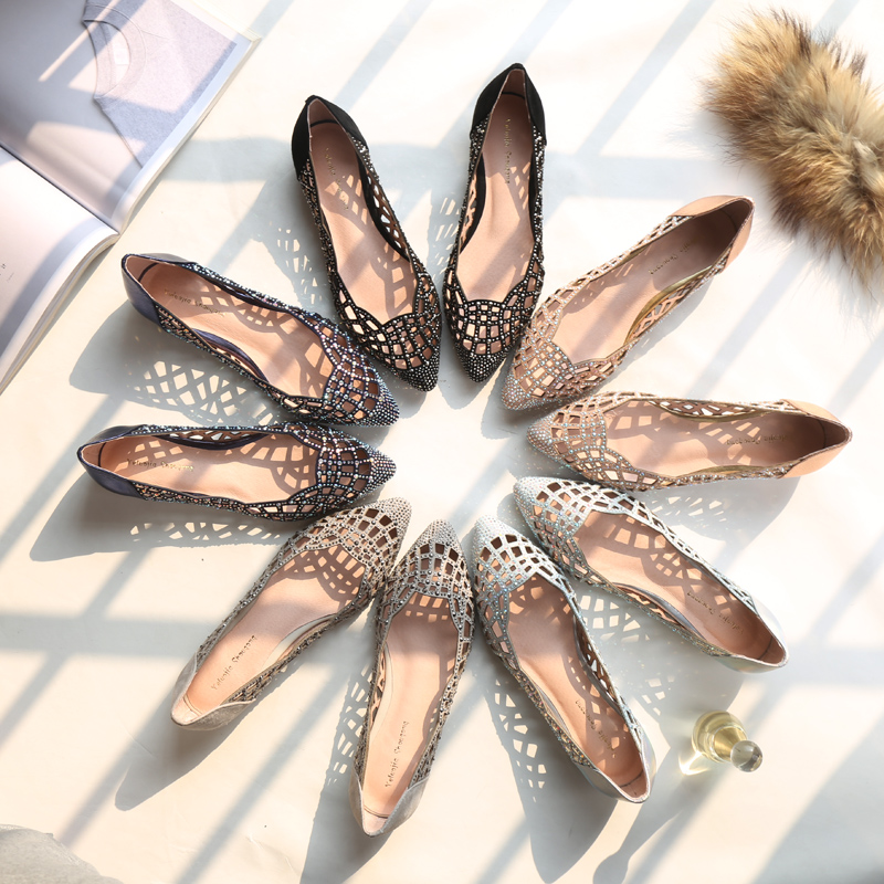 欧美2023春夏季新款尖头镂空水钻凉鞋真皮平跟平底时尚舒适女单鞋