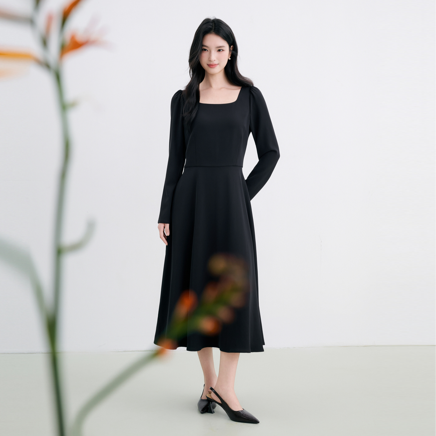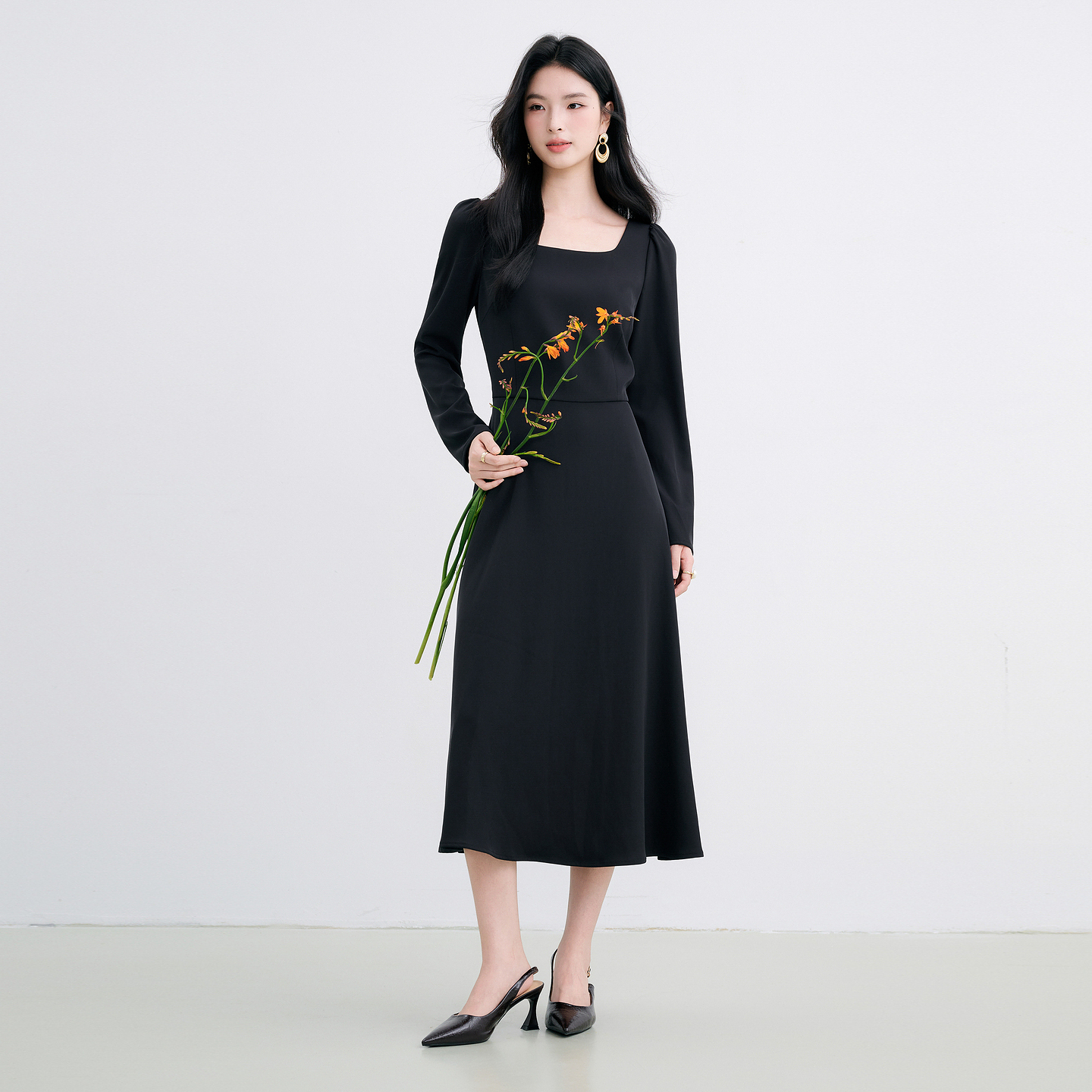 Basic House/百家好法式方领泡泡袖连衣裙25秋季修身剪裁设计长裙