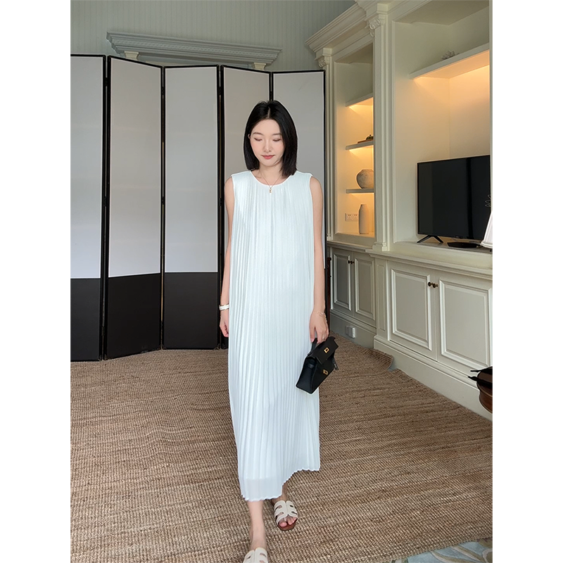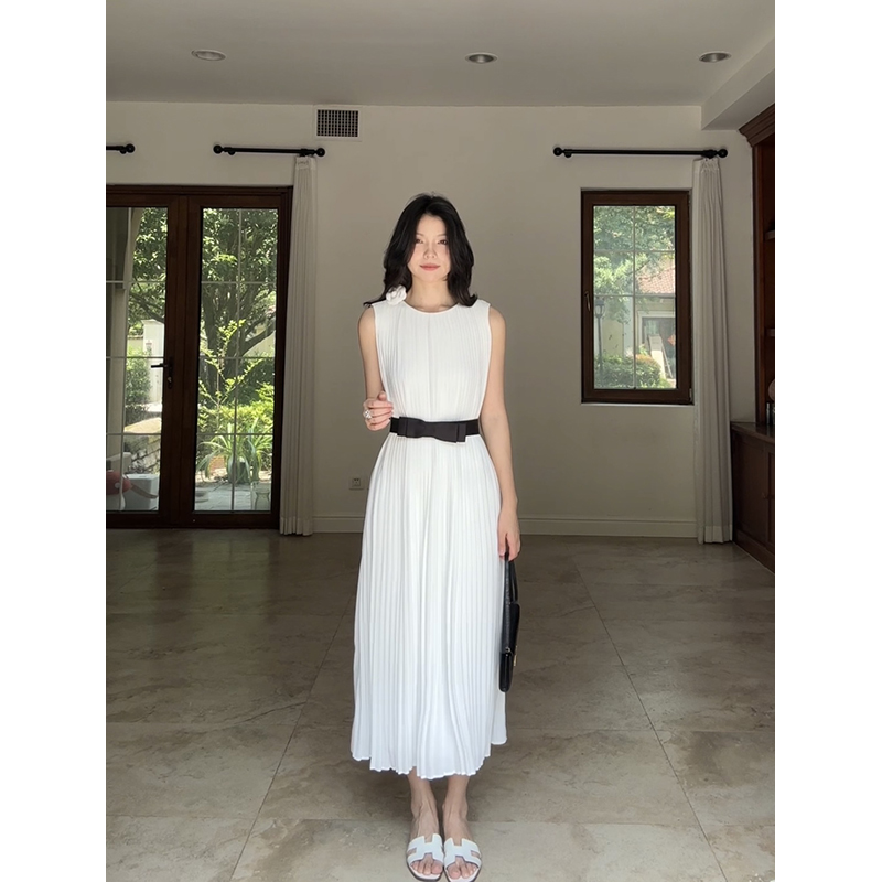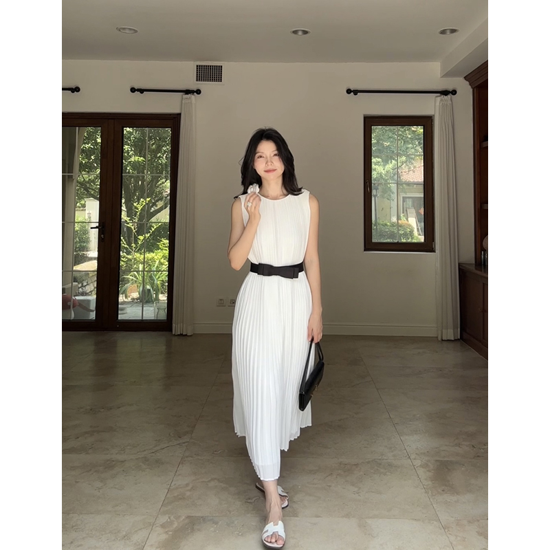 郭九九呢立体花朵重工压褶宽松显瘦无袖连衣裙夏季简约长裙送腰带