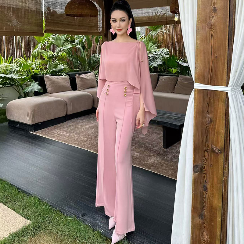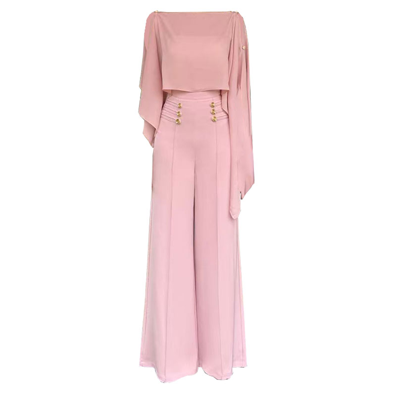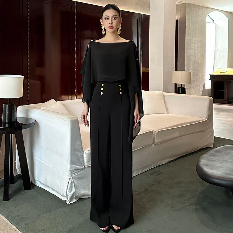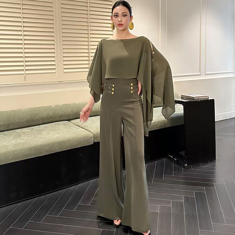 雪纺飘逸感上衣高腰阔腿裤两件套