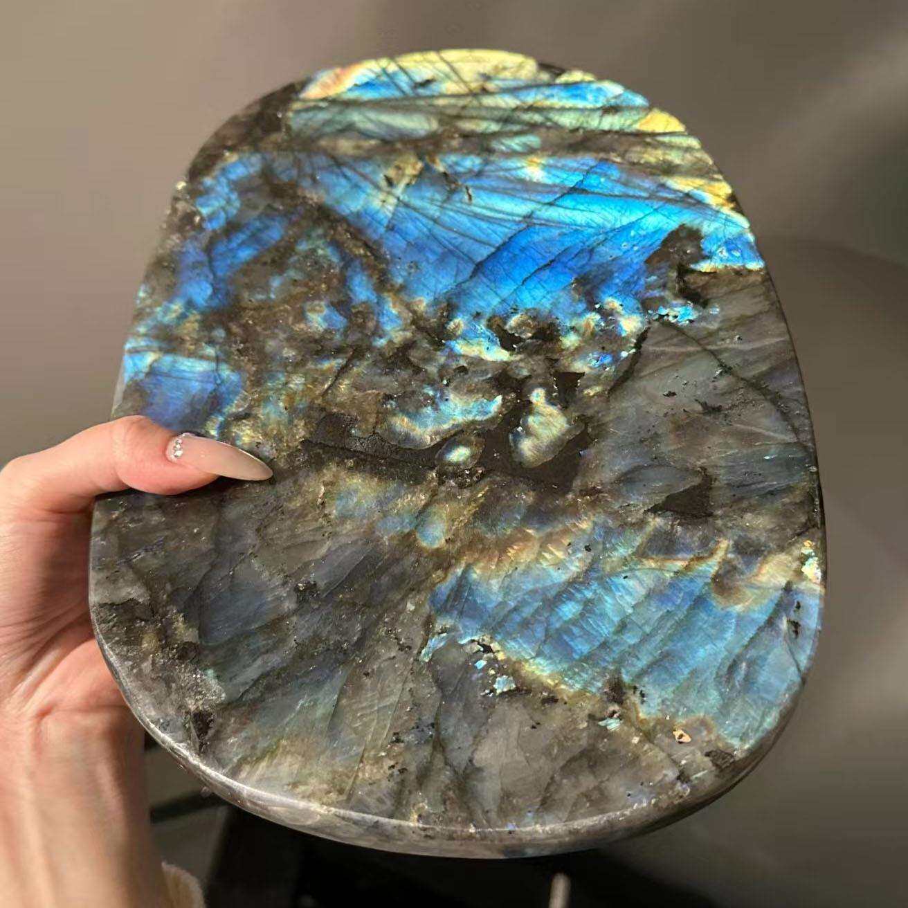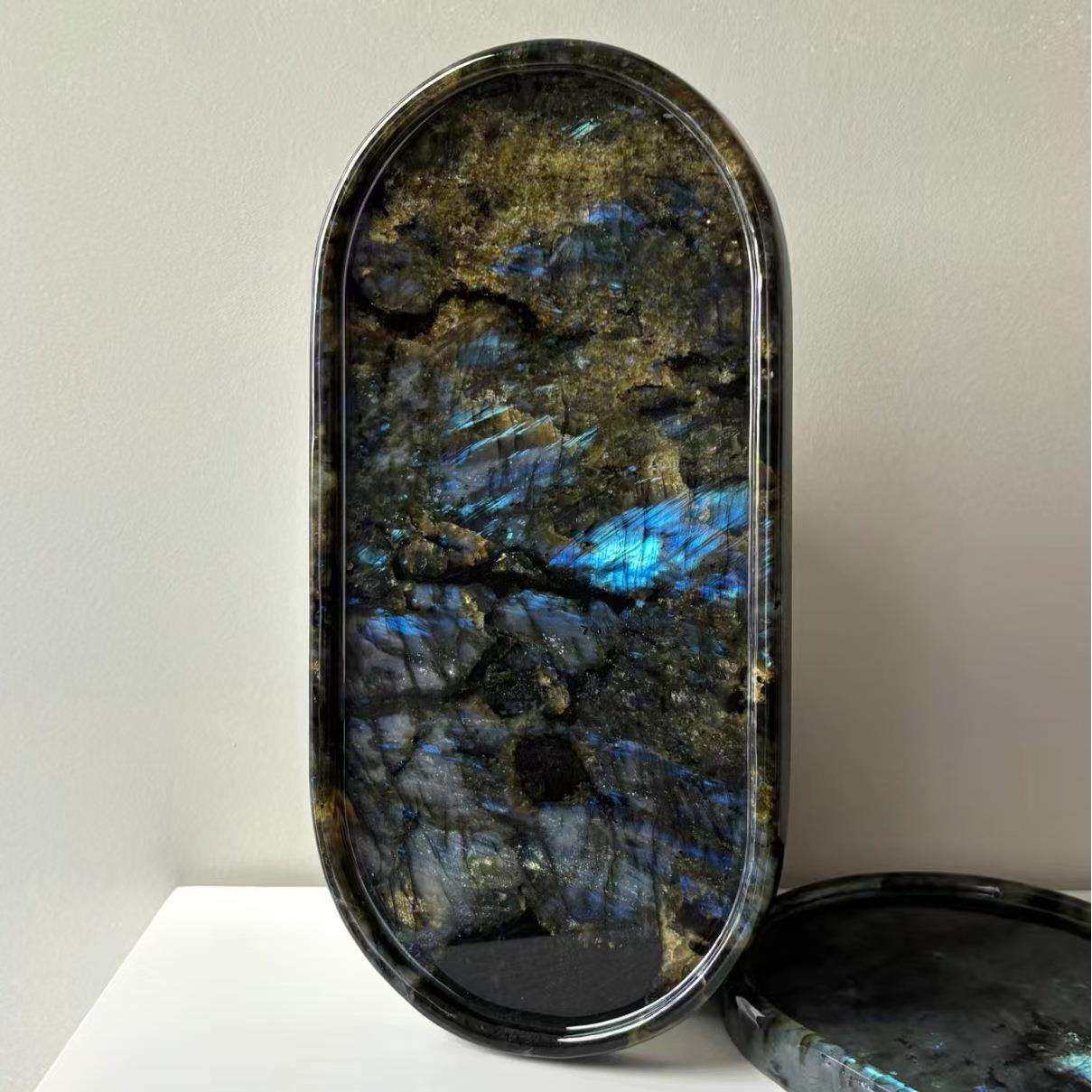 水晶拉长石原石托盘圆盘月光石摆件蓝翡翠奢石水晶雕刻工艺品