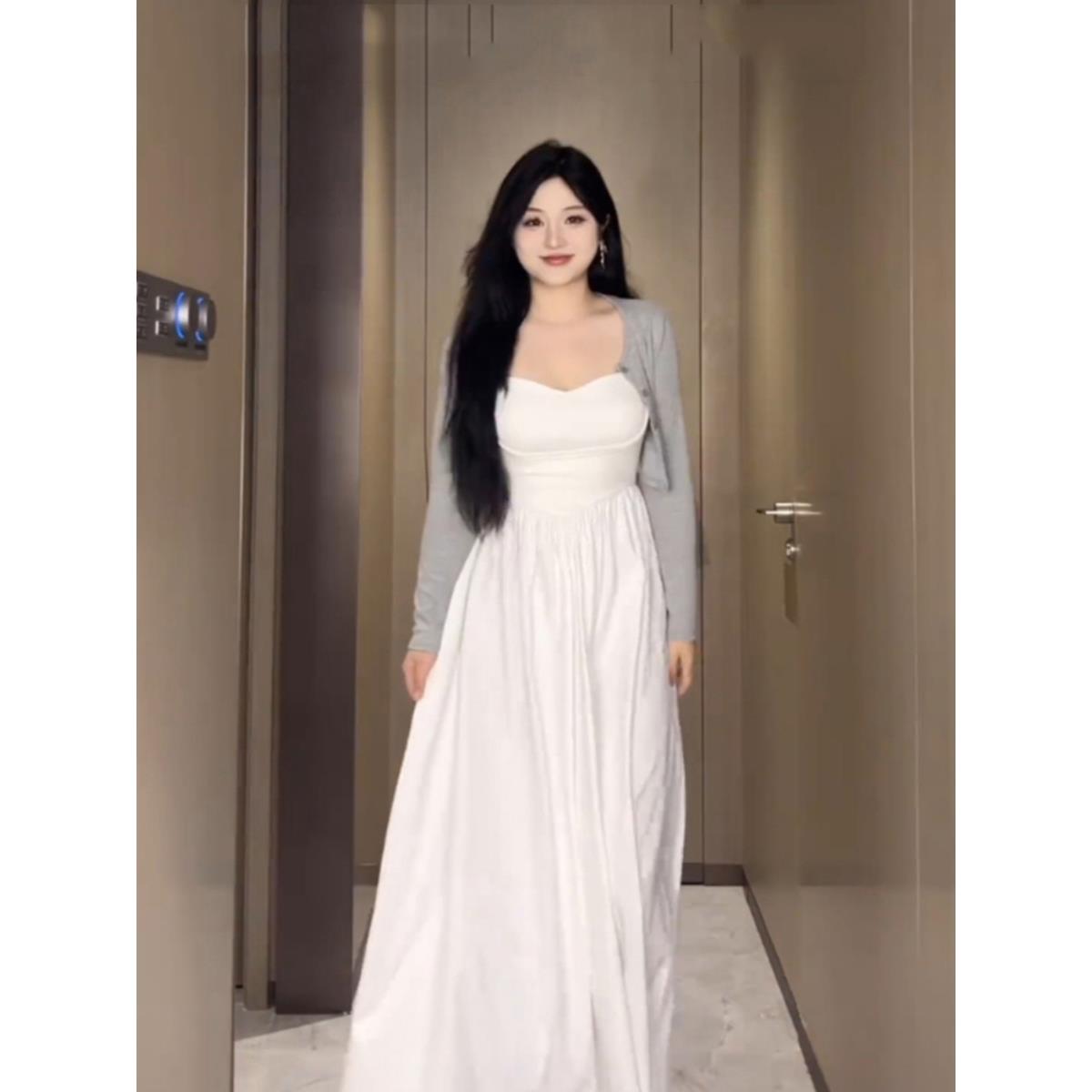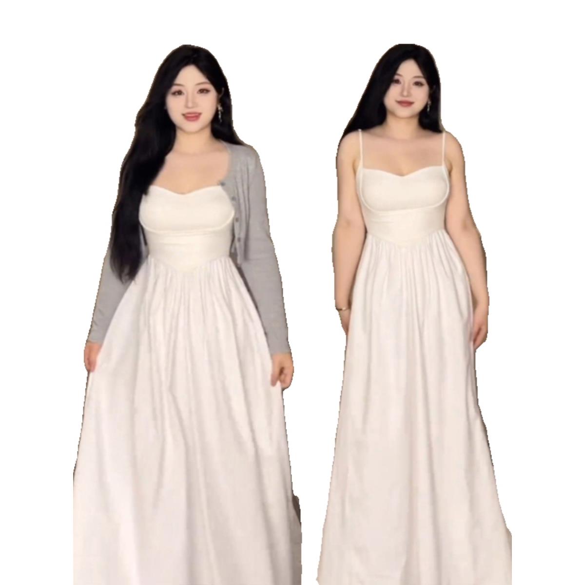 大码胖mm法式收腰白色吊带连衣裙女夏季气质显瘦长裙开衫两件套装