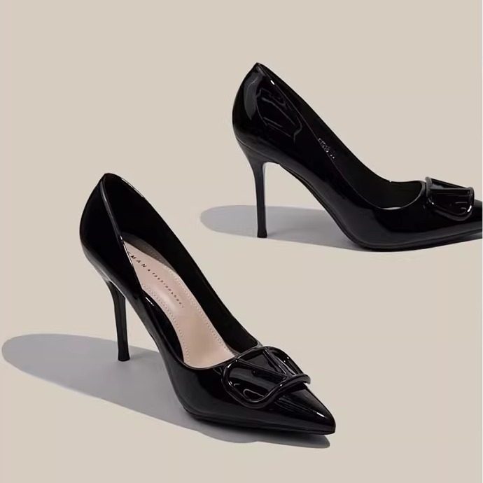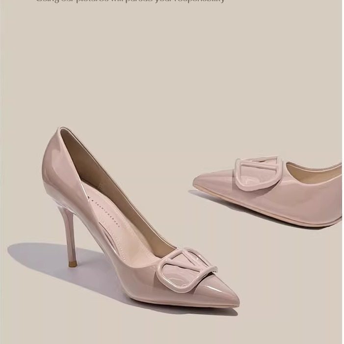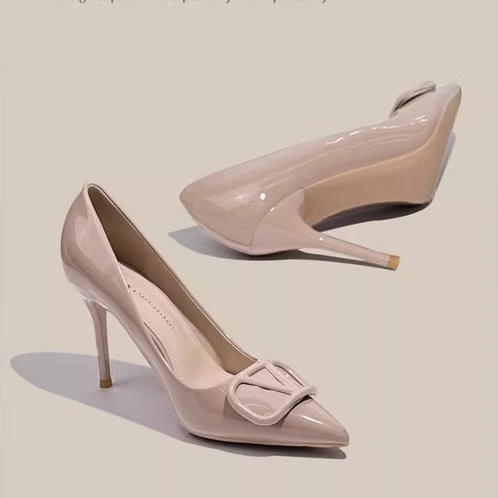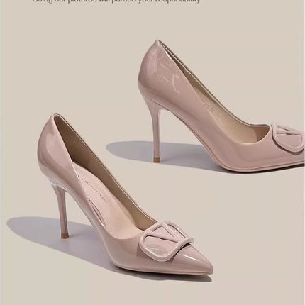 网红V扣气质名媛尖头细跟裸粉色高跟鞋女2025年新款漆皮性感浅口