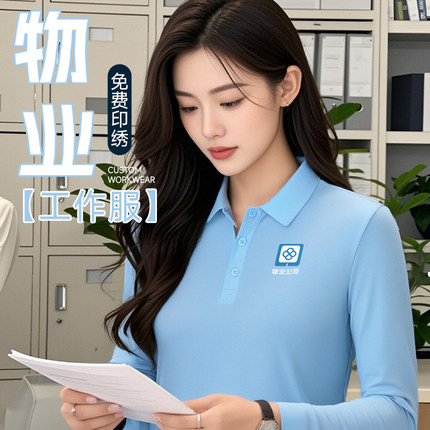 蓝色长袖T恤POLO衫工作服定制印字logo订翻领物业碧桂园团队聚会