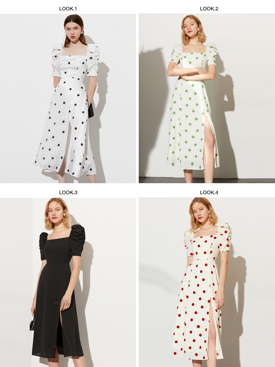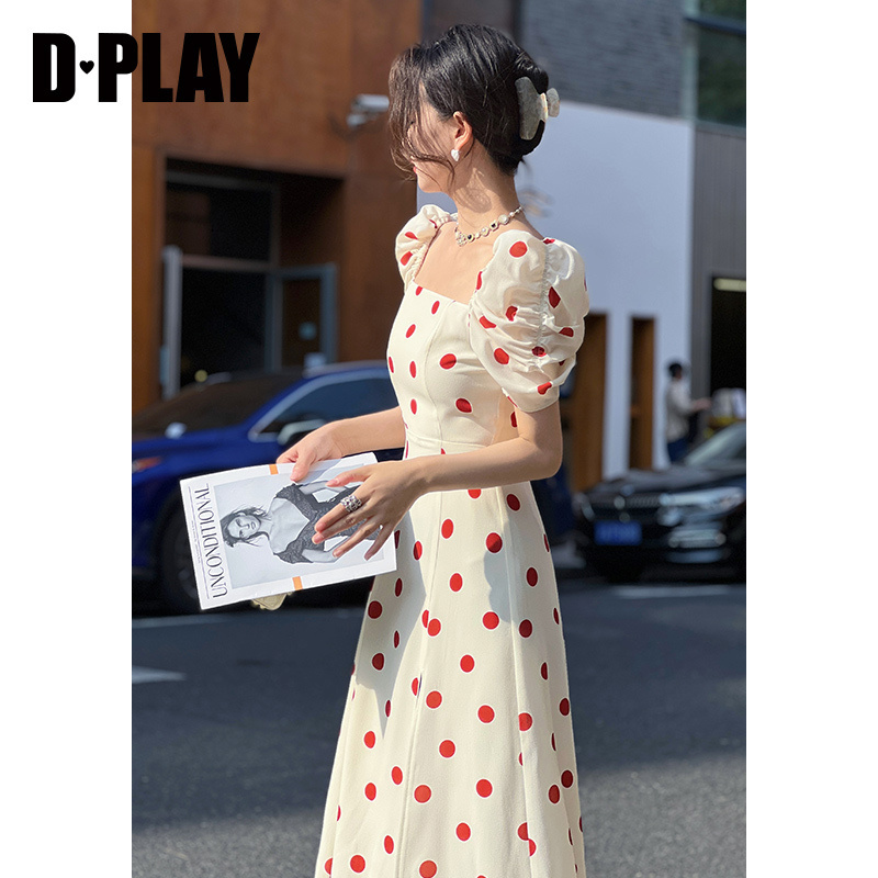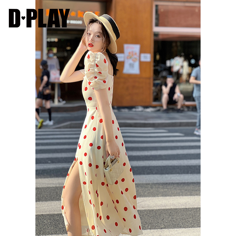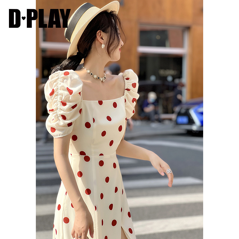 DPLAY夏新款法式方形领泡泡羊腿袖米色底红波点侧开衩连衣裙