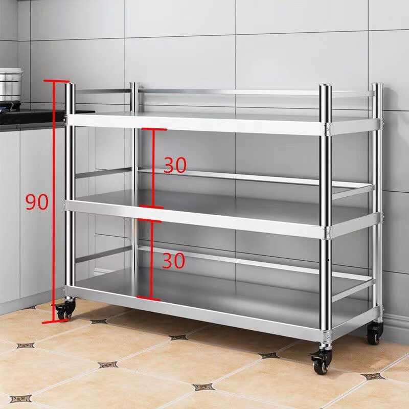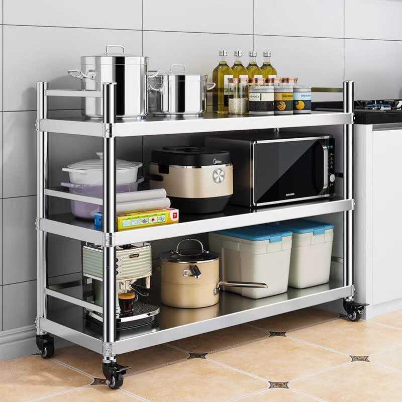 可移动置物架厨房不锈钢带围栏微波炉烤箱架子三层落地锅架带轮子