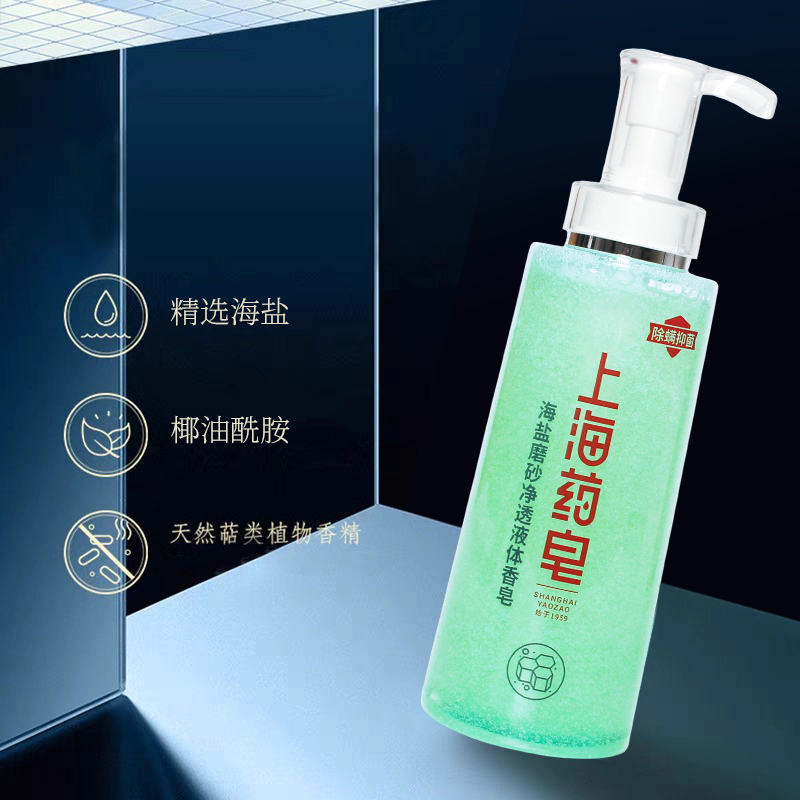 上海药皂海盐磨砂净透液体香皂500g除螨抑菌
