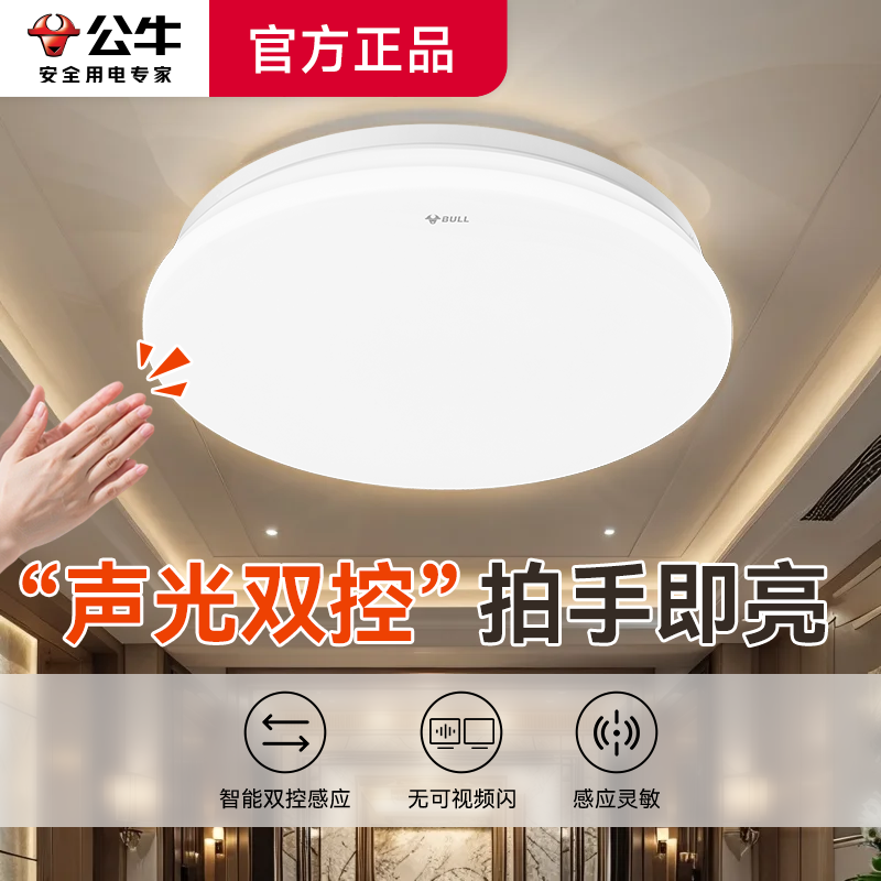 公牛智能感应吸顶灯声光控制LED节能高亮楼梯玄关阳台超薄设计
