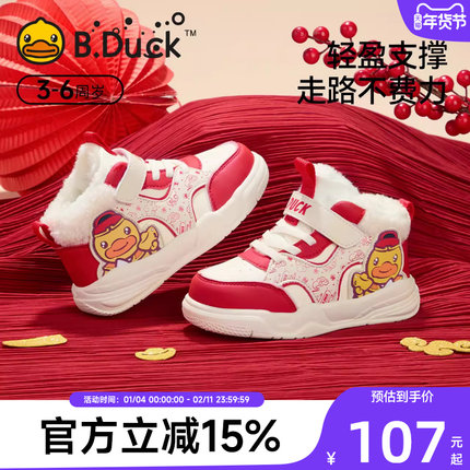 小黄鸭中国红儿童加绒高帮板鞋