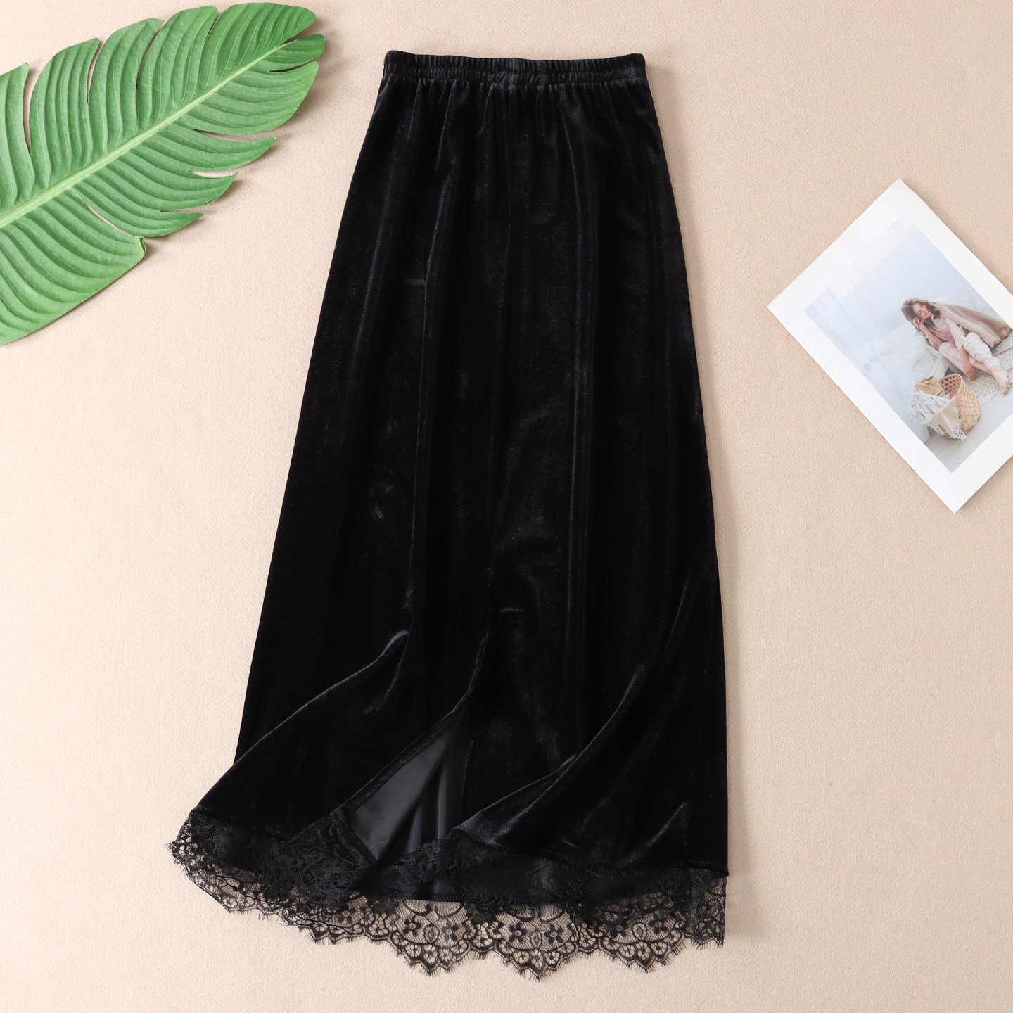 精致温婉显瘦高金丝绒半身裙女秋冬中长款过膝气质蕾丝A字裙W25