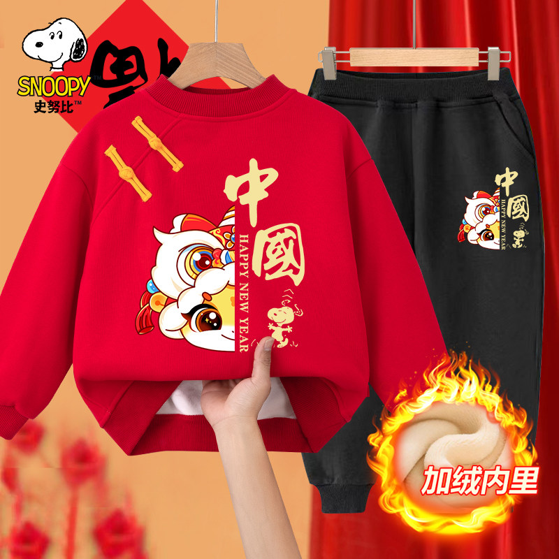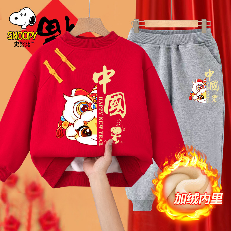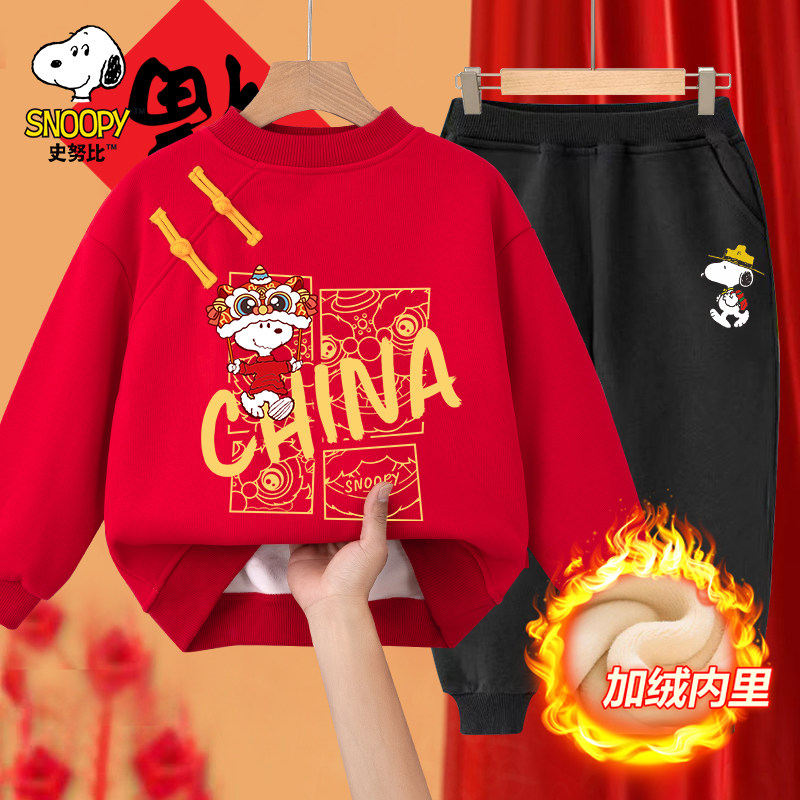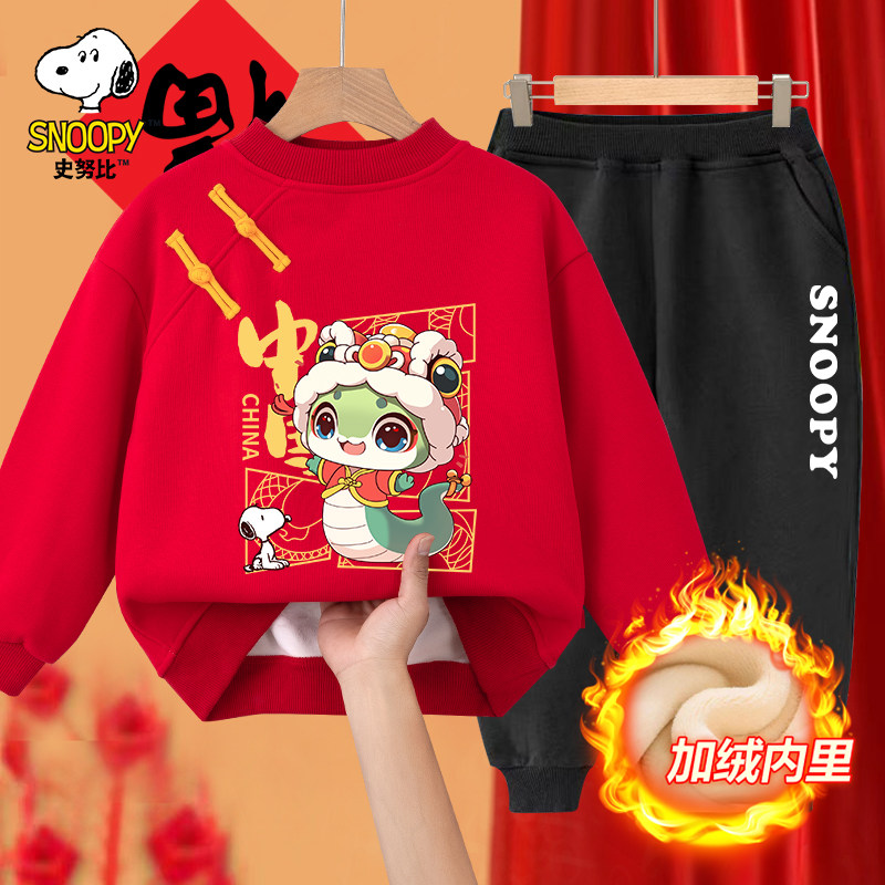 史努比儿童新年套装加绒2026新款秋冬男童女童红色圆领卫衣两件套