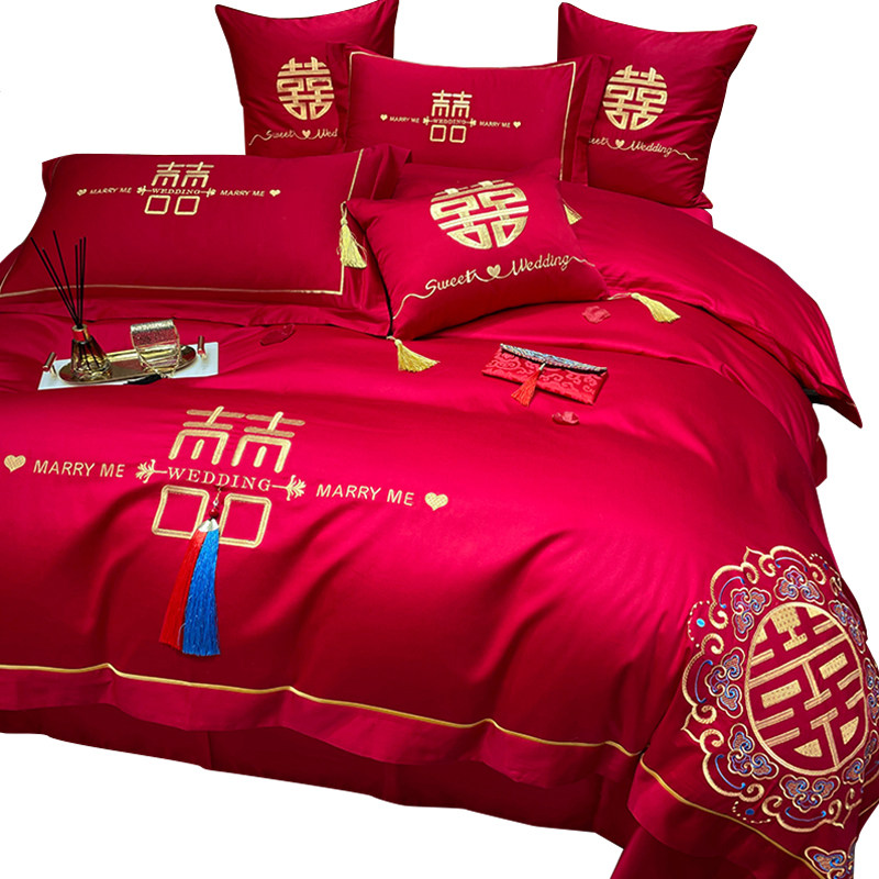 中式婚庆四件套120支长绒棉大红色全棉刺绣结婚被套床单床上用品4