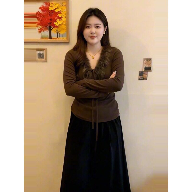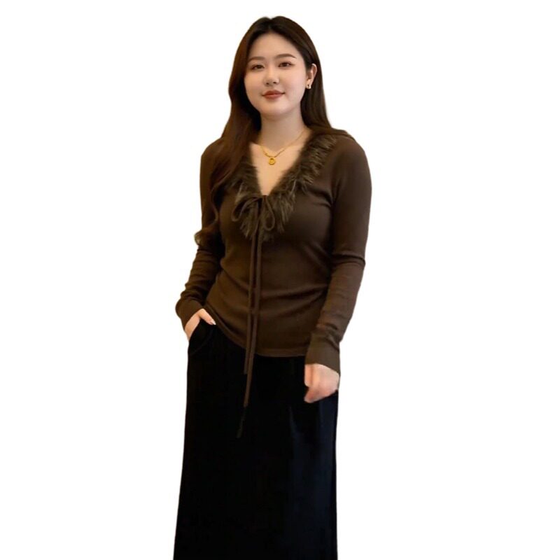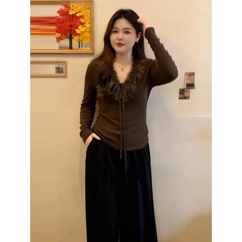 大码复古毛领系带长袖T恤女2026春秋款胖mm显瘦修身磨毛打底上衣