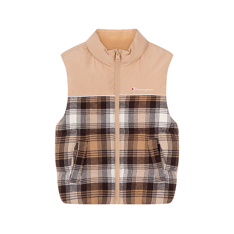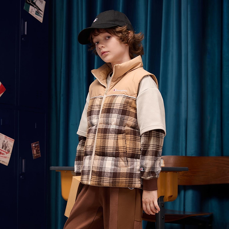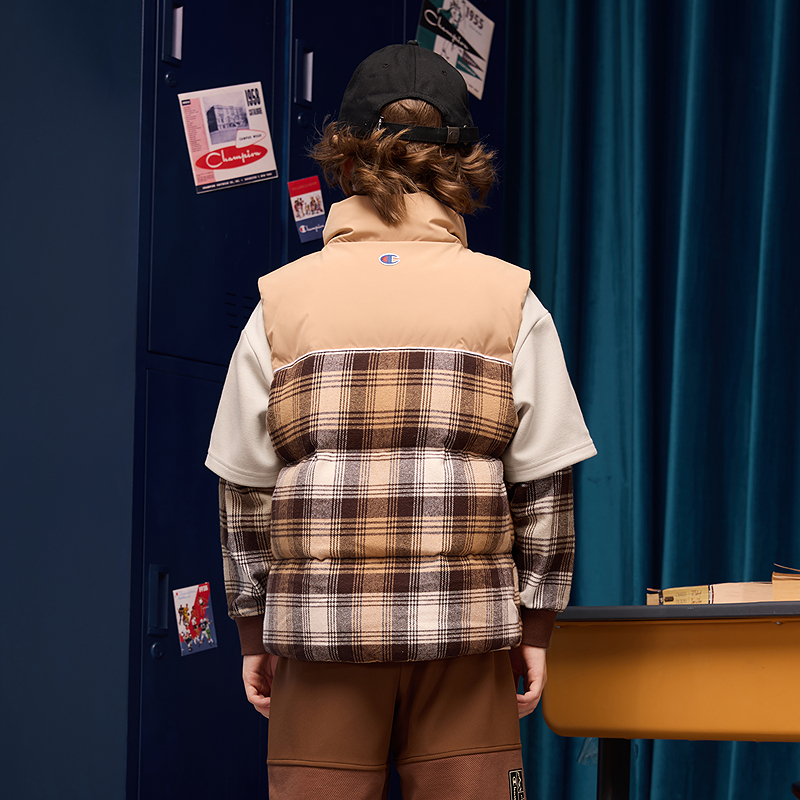 【抗菌】Champion冠军男女童装25冬新款复古格子拼接羽绒马甲外套