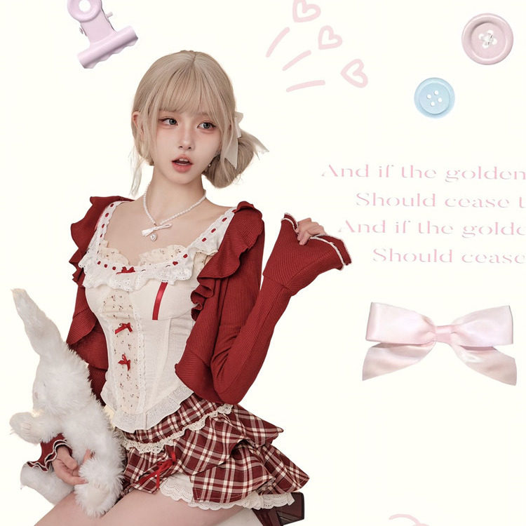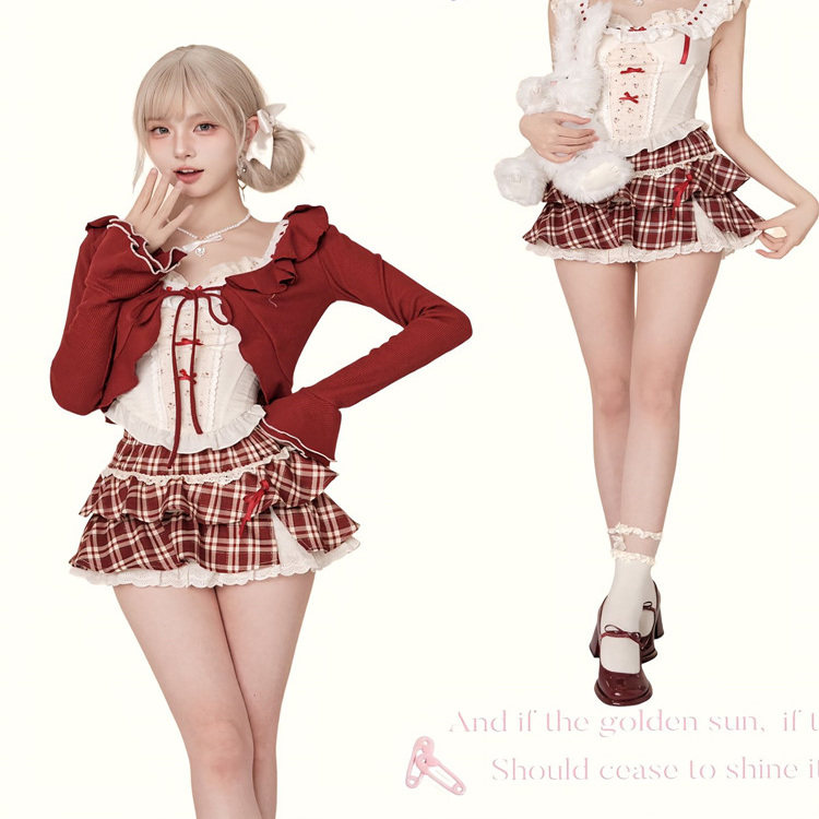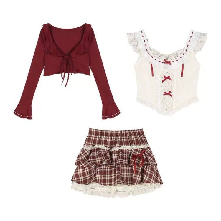 夏季纯欲甜妹蕾丝套装少女开衫蝴蝶结吊带上衣格子短裙背心三件套