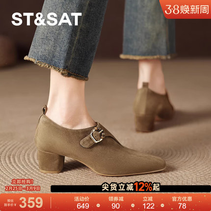 浅棕粗跟鞋,复古扣饰,绒面质感