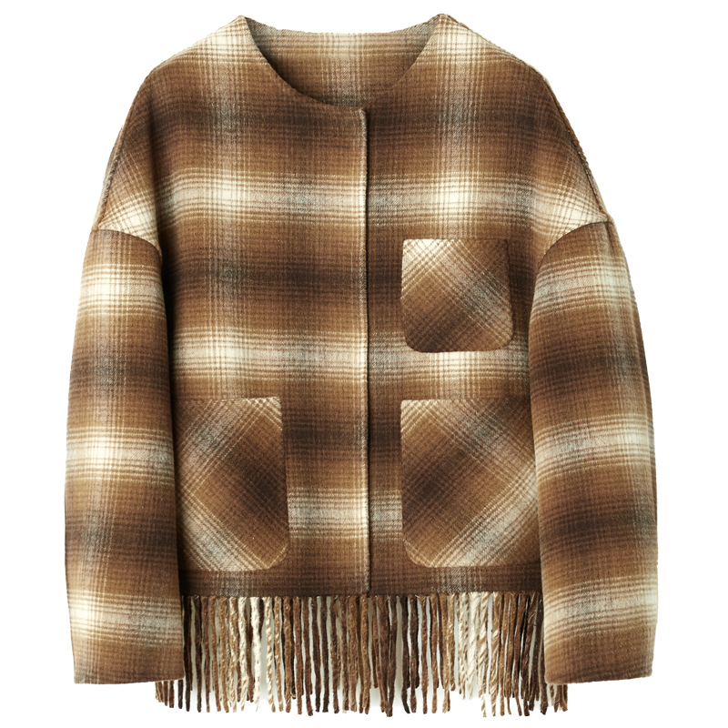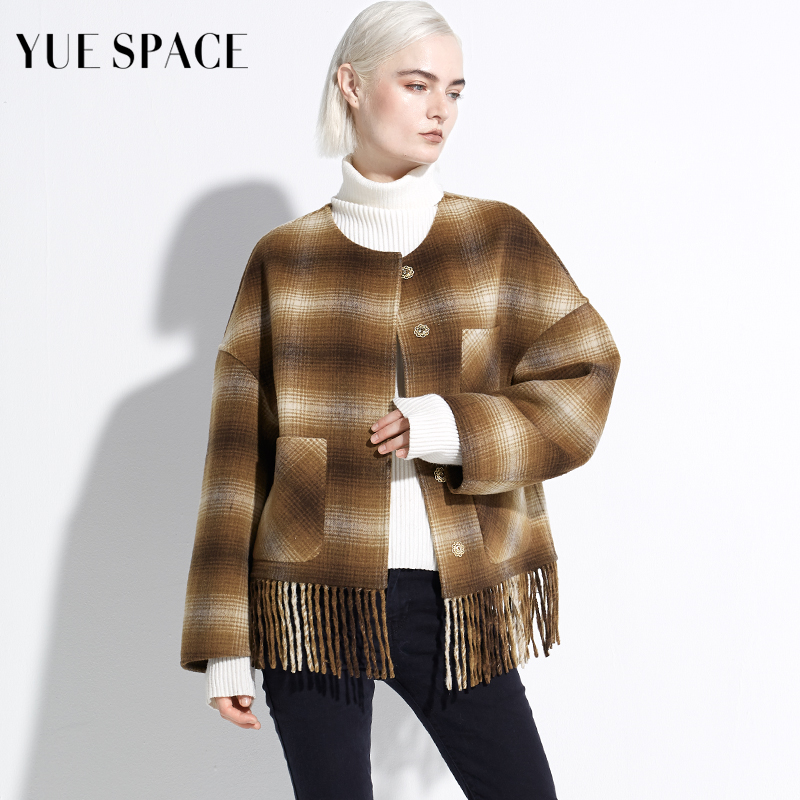 YUESPACE双面羊毛外套格子上衣秋冬女士宽松圆领流苏短款毛呢上衣