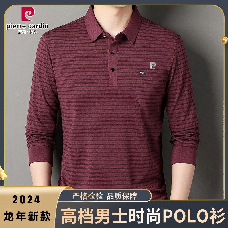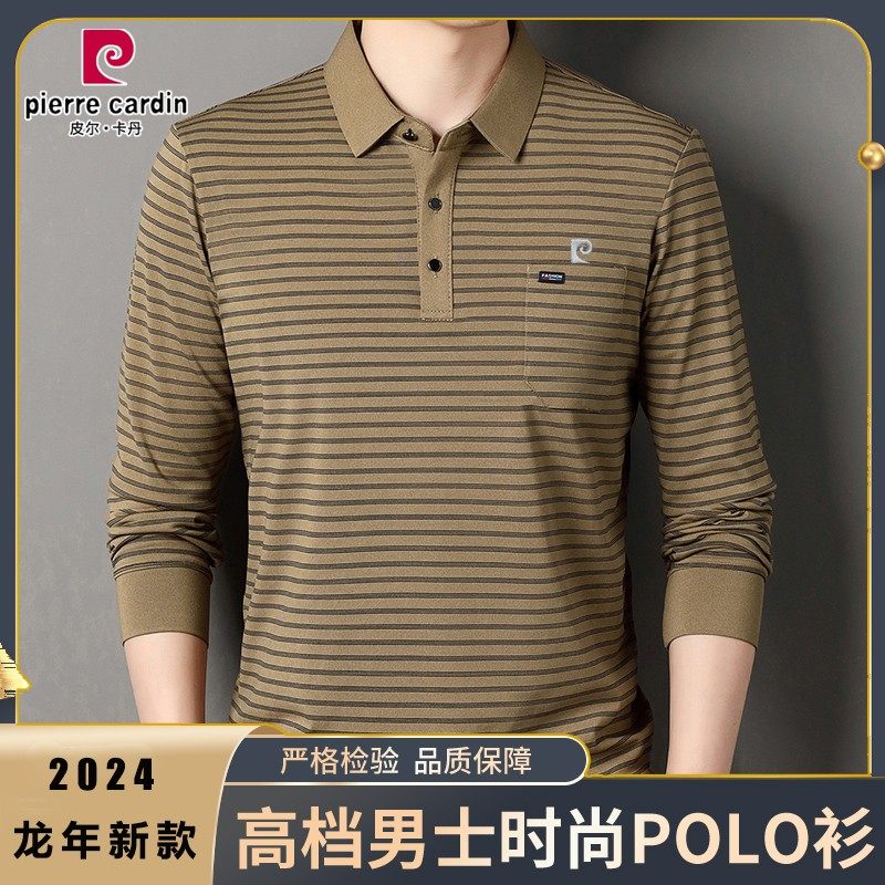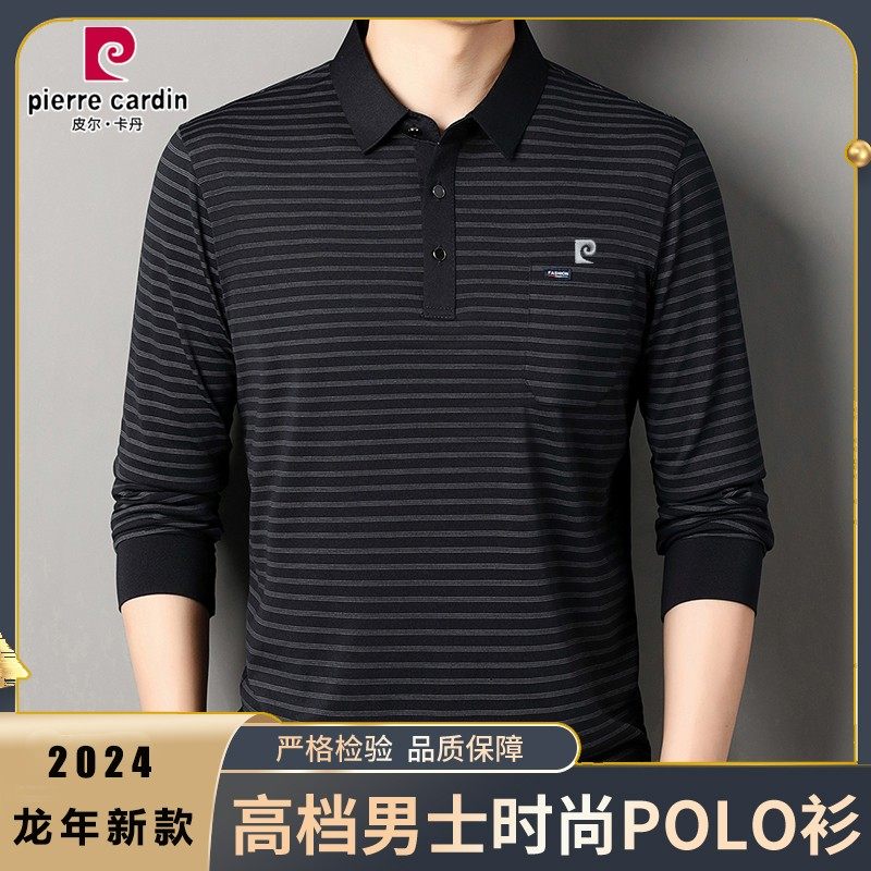 皮尔卡丹桑蚕丝长袖T恤男春秋新款条纹翻领POLO衫男装官方旗舰店