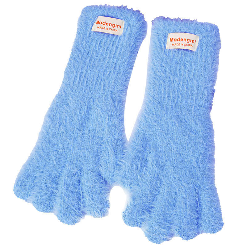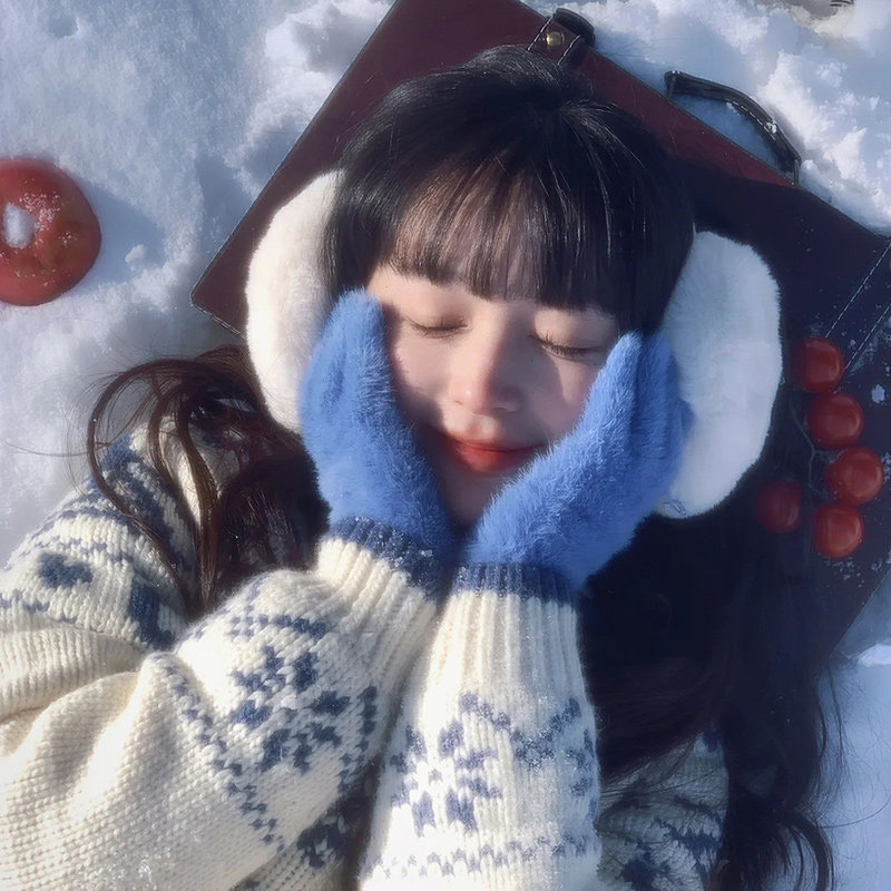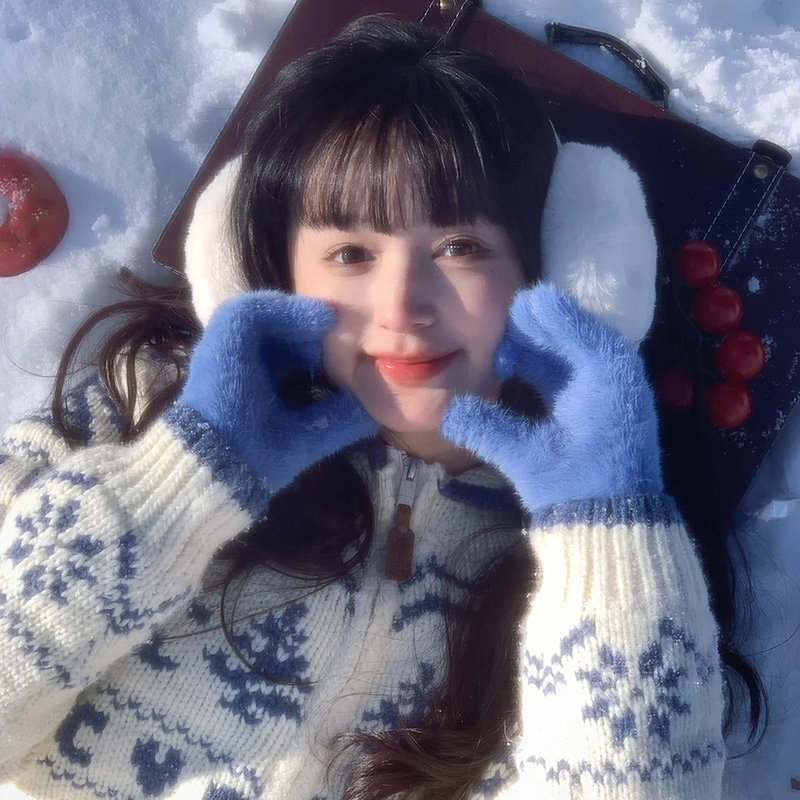蓝色针织手套女士冬女生可爱加厚防寒保暖毛绒户外可触屏御寒骑行