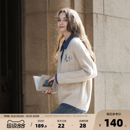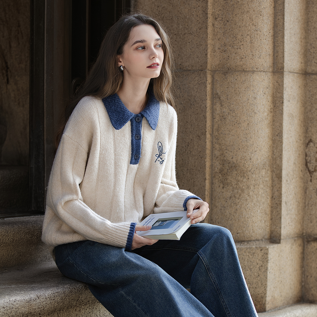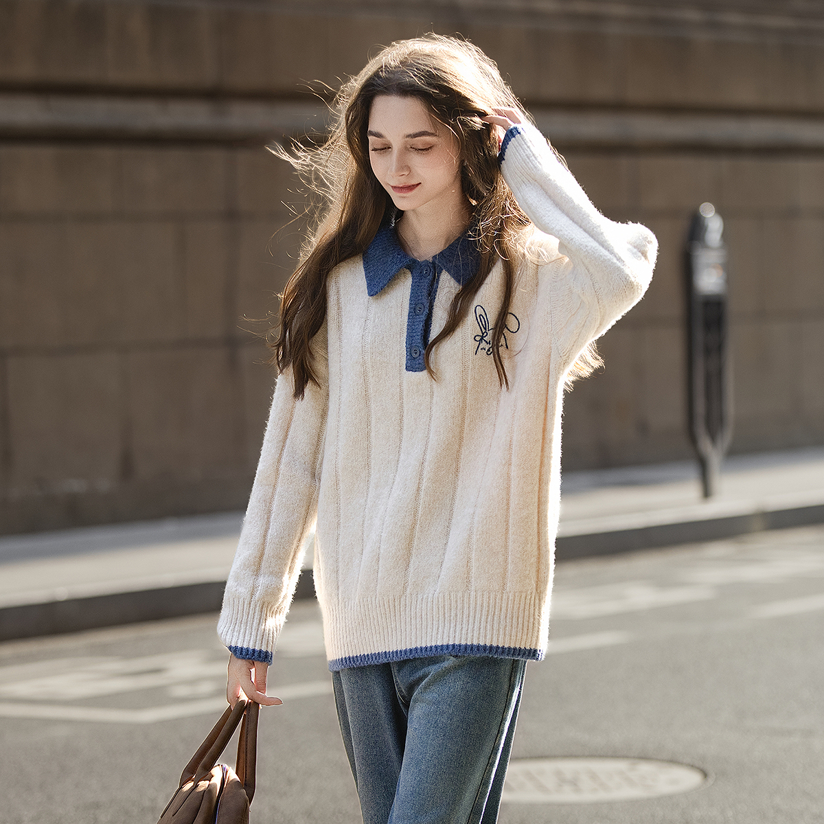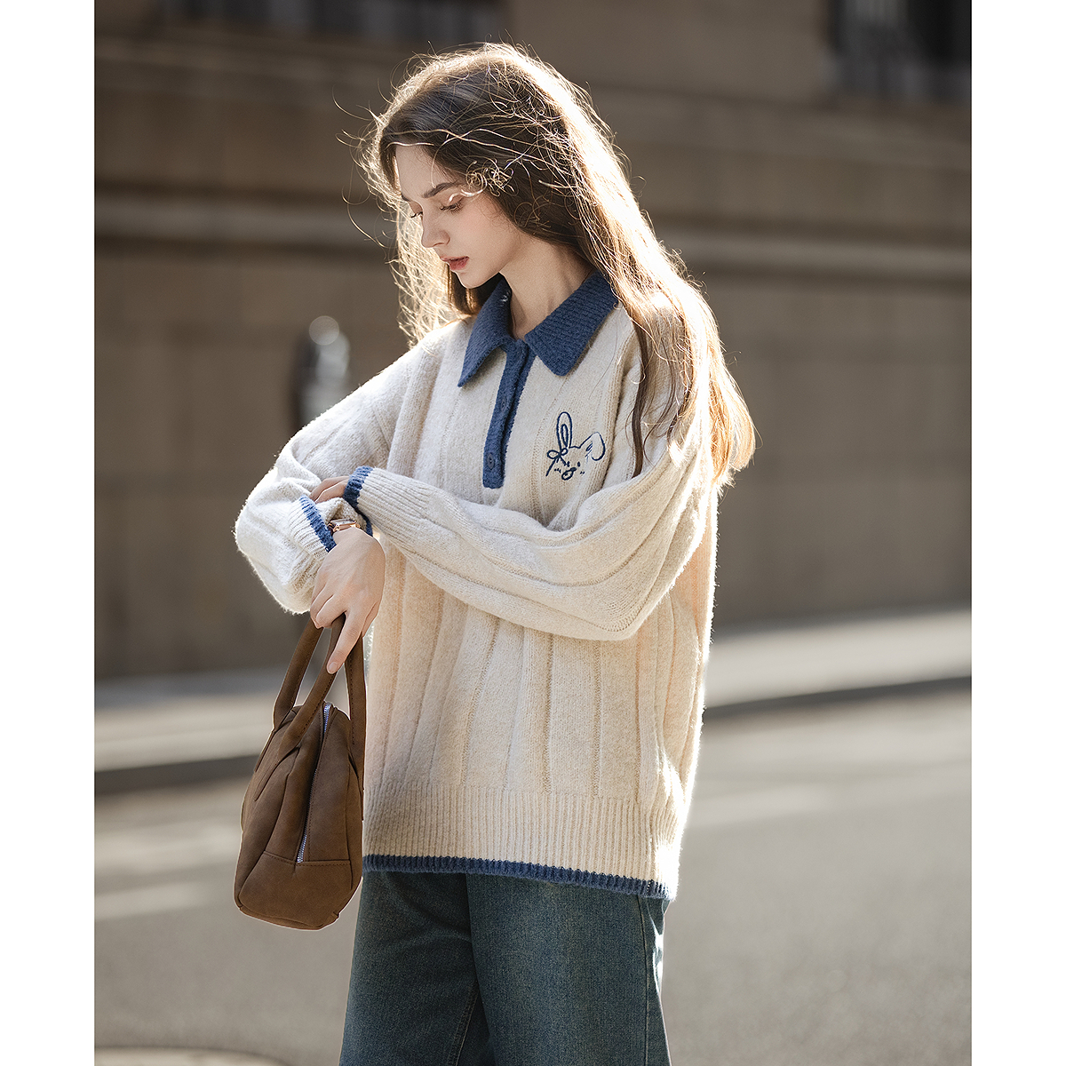 唐狮2025秋冬季套头毛衣女POLO领撞色拼接卡通可爱少女风毛线衫