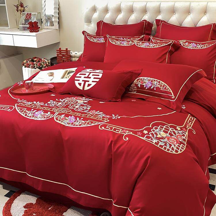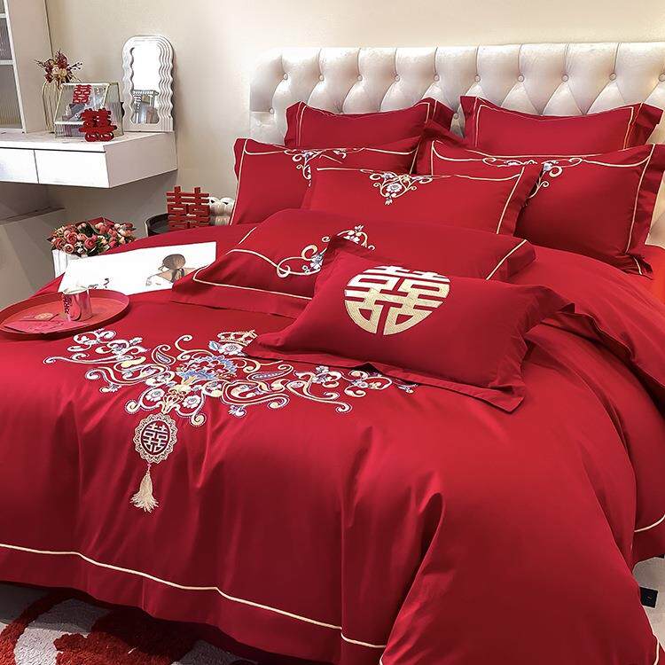 婚件陪嫁龙F98SJMH凤被套新纯棉红色婚庆四套床单床笠款结婚上床