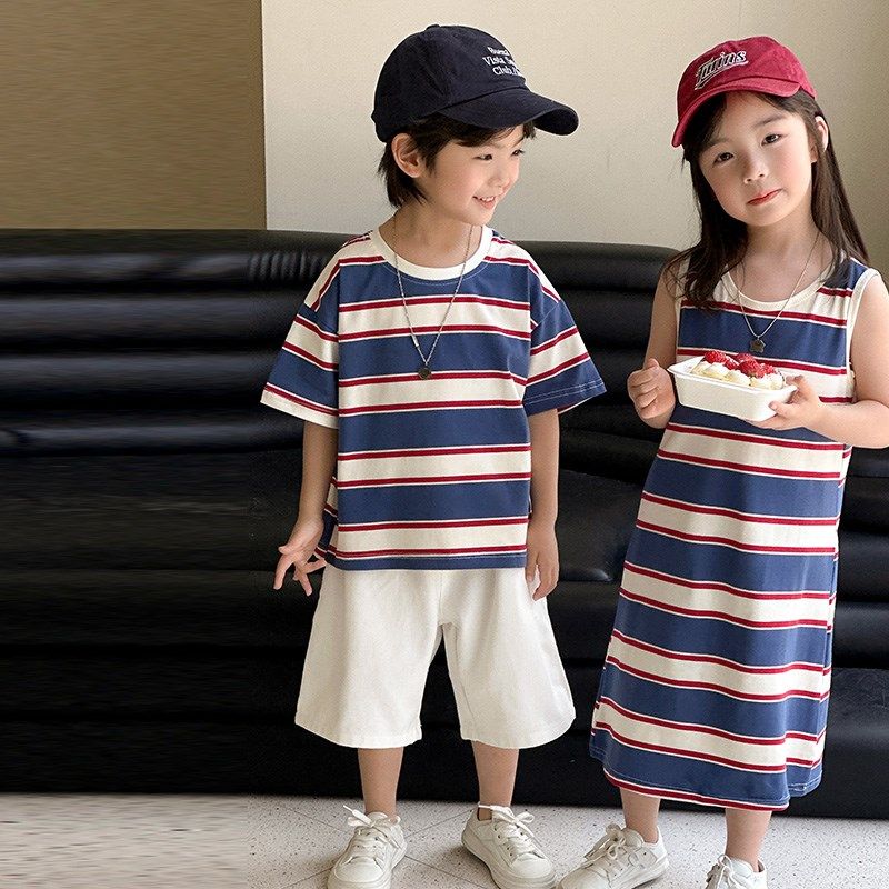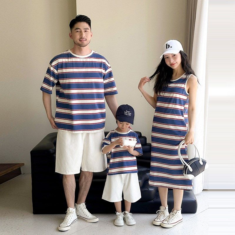 高端亲子装夏装一家三四口短袖t恤条纹宽松时尚母女无袖连衣裙