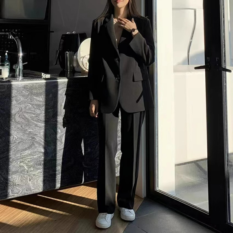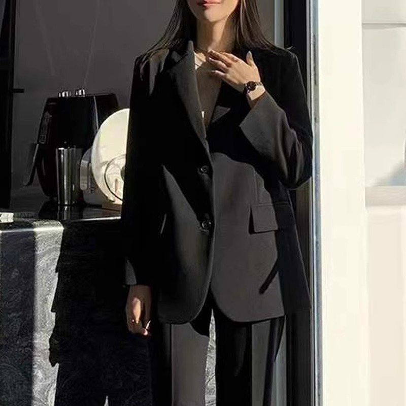 西装套装女大学生公务员面试答辩职业垫肩西服黑外套宽松正装工