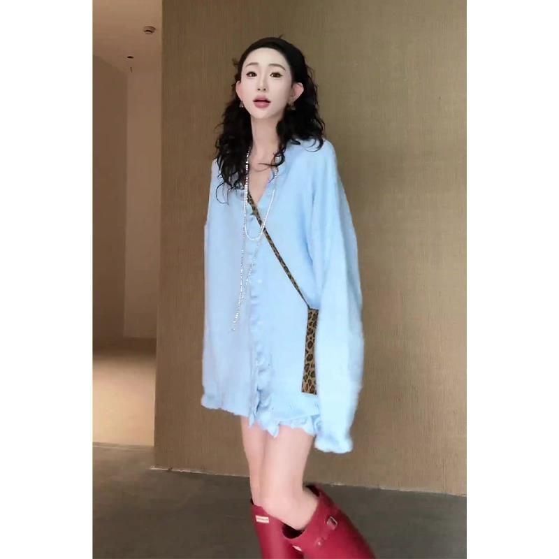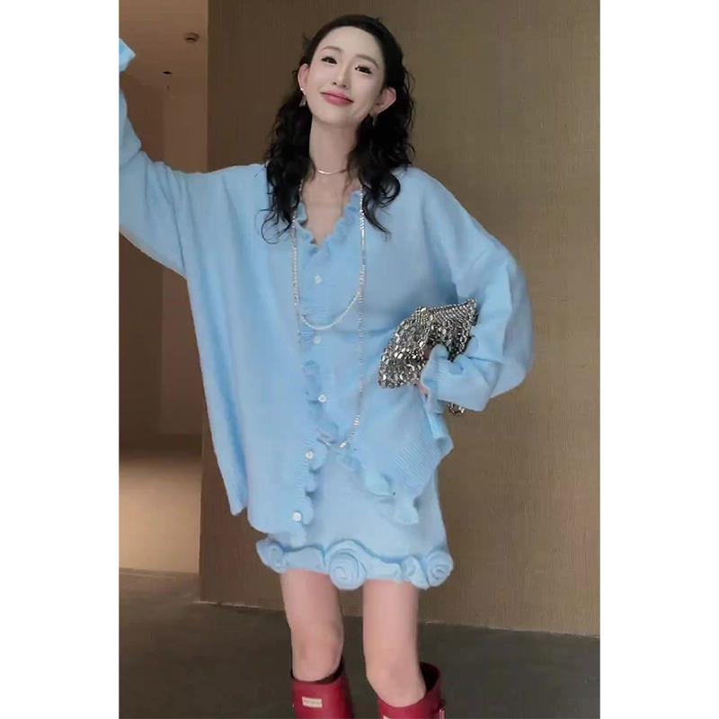2025超火韩系早秋氛围感穿搭一整套蓝色木耳边毛衣半身裙两件套装