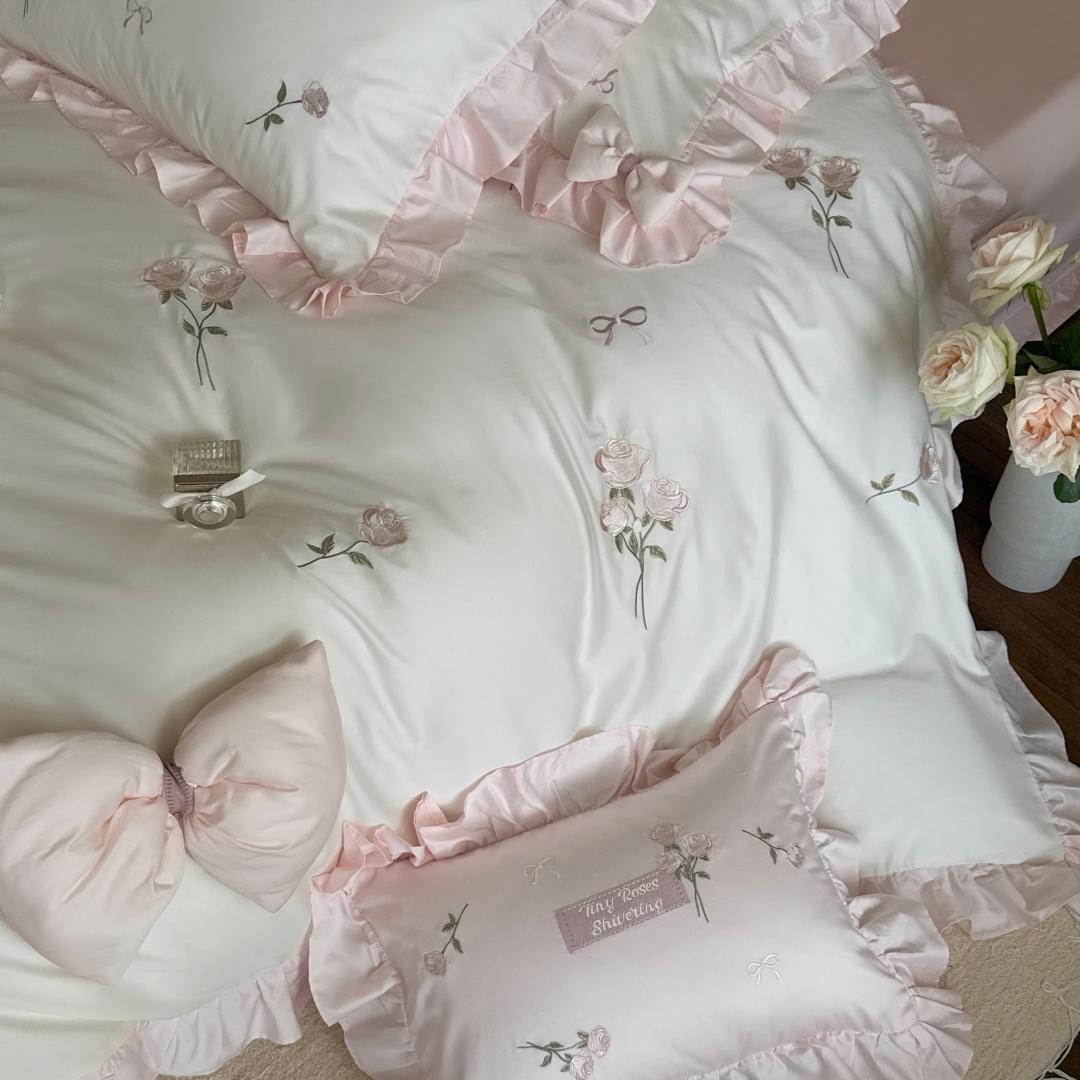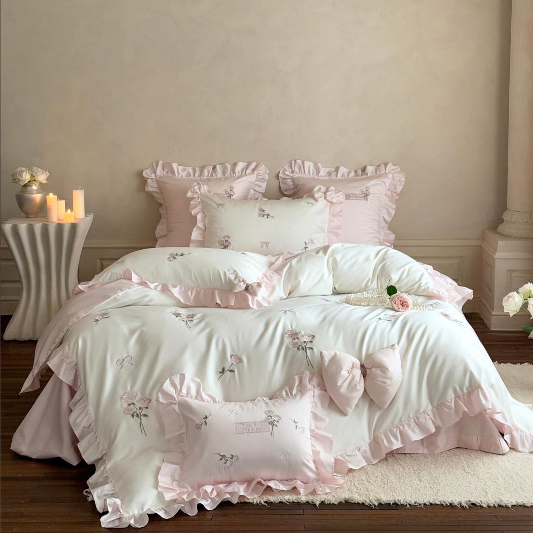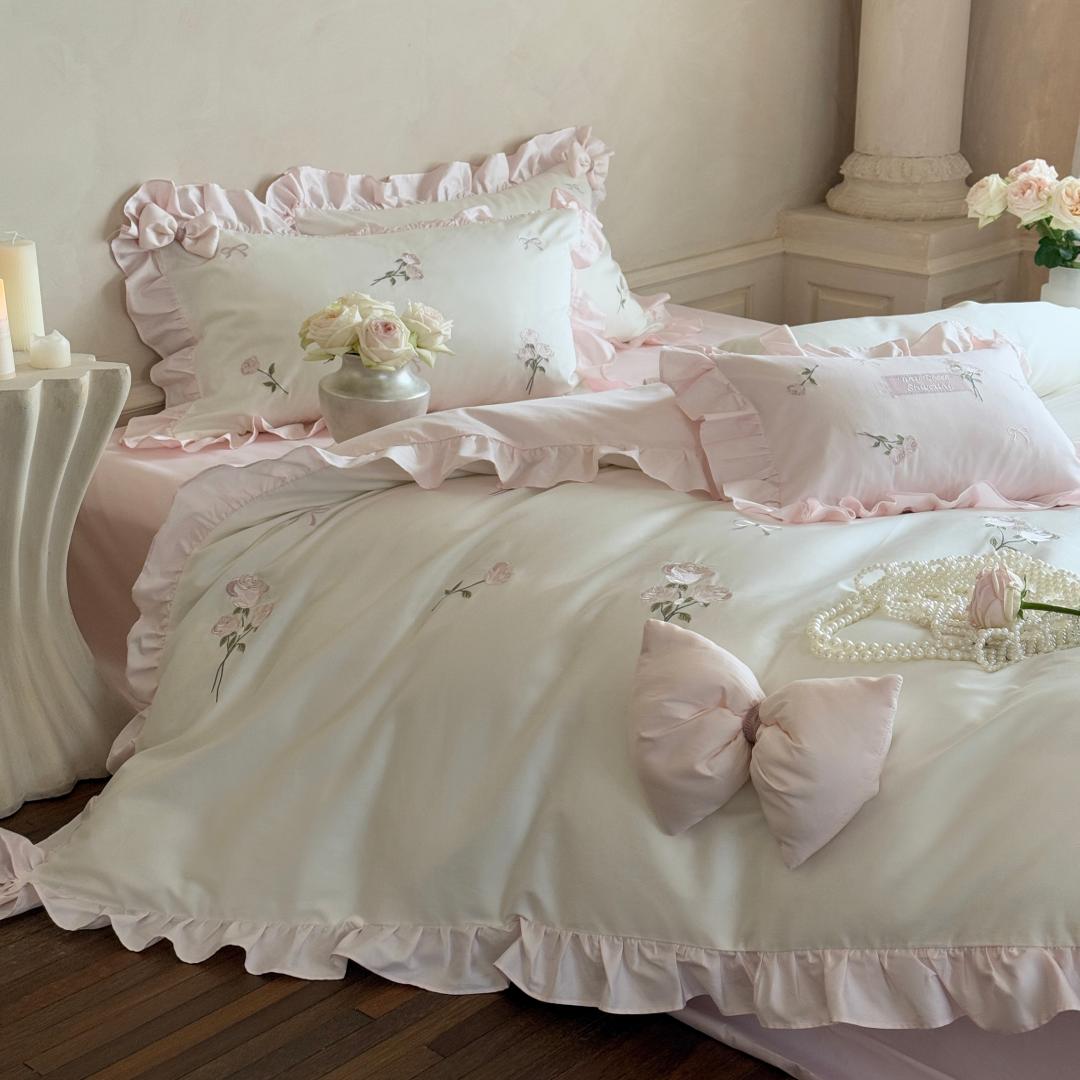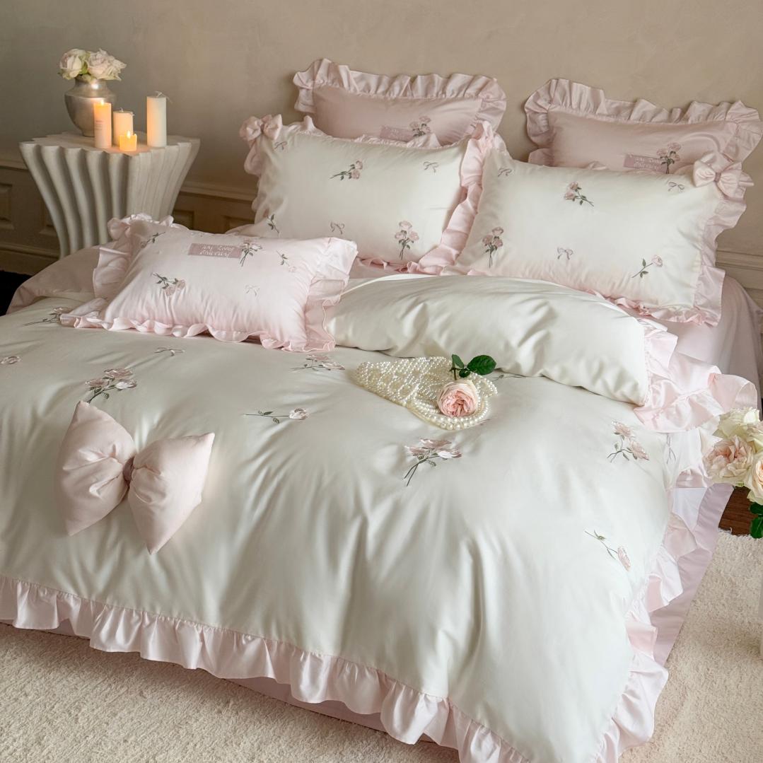 法式少女心100S长绒棉全棉四件套纯棉蝴蝶结玫瑰刺绣被套床上用品