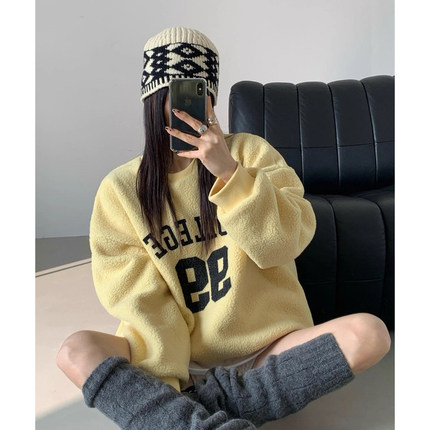 美式复古撞色字母印花加绒卫衣女秋冬宽松休闲保暖羊羔毛套头上衣