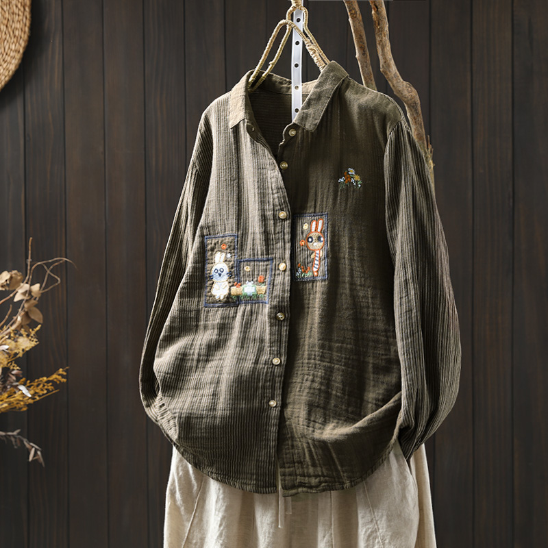 贴布刺绣纯棉纱条纹衬衫女宽松长袖春秋新款文艺休闲减龄翻领上衣