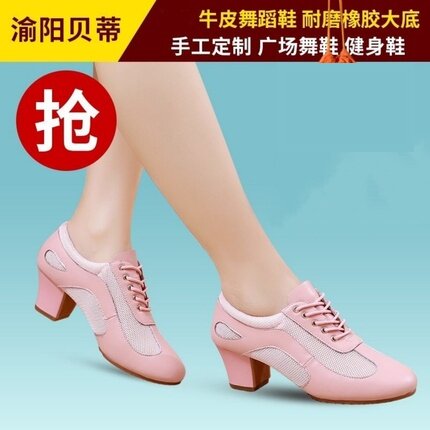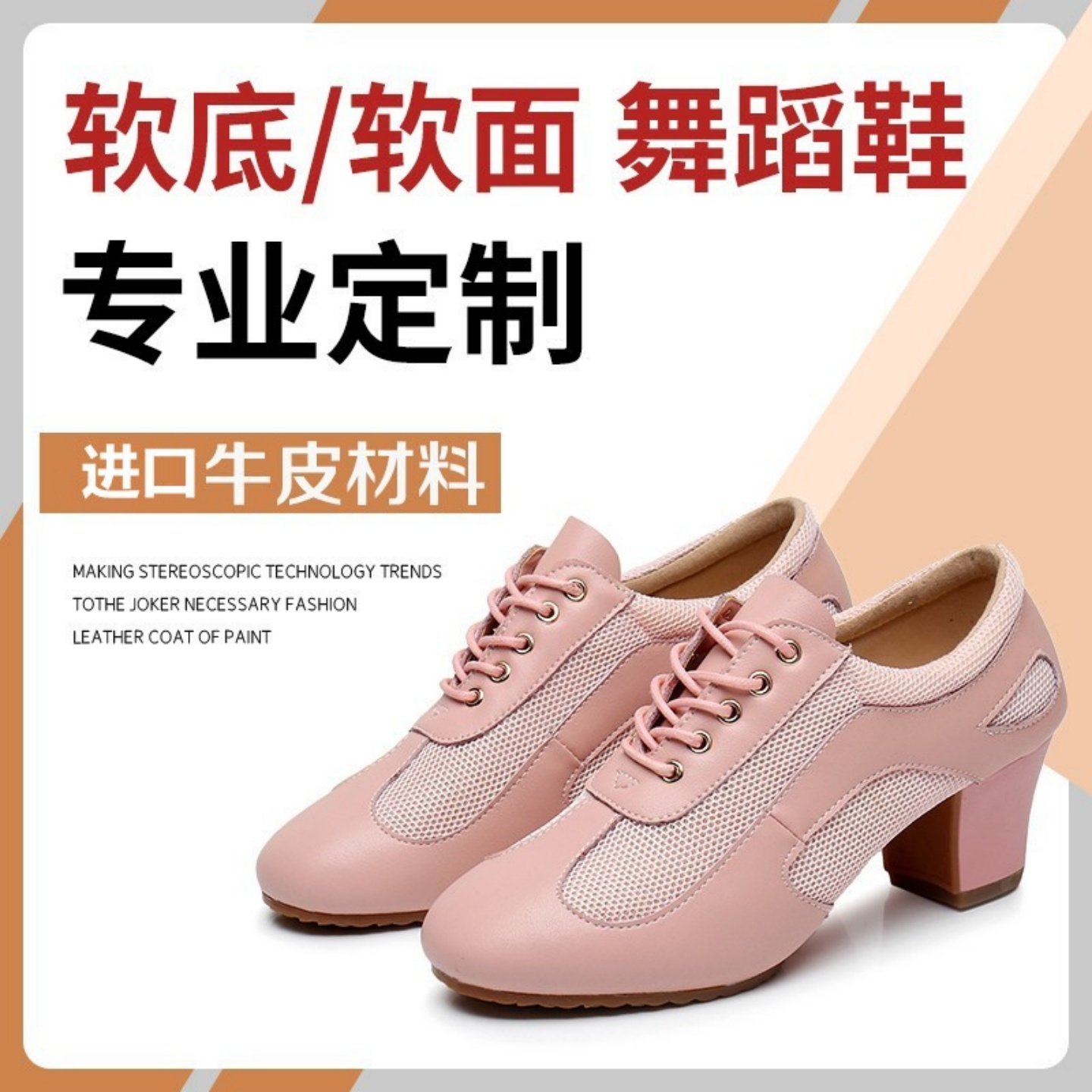 品牌渝阳正品拉丁舞跳舞鞋女软底真皮网面中跟系带粉色专业交谊舞