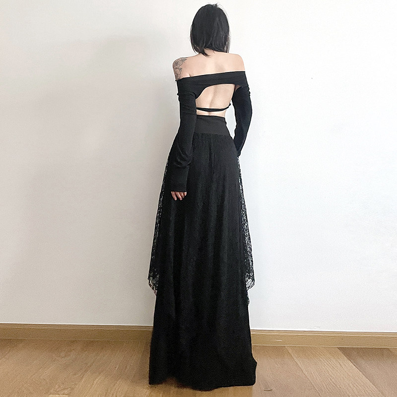 gagaopt2025春季新款赫本风黑色半身裙高腰显瘦绑带蕾丝A字长裙潮