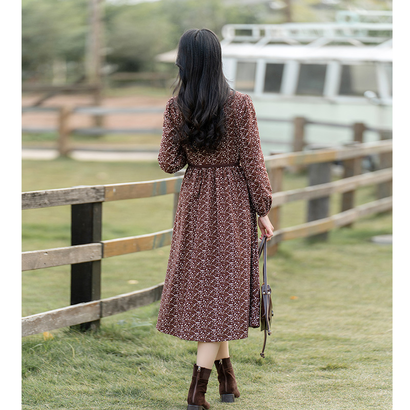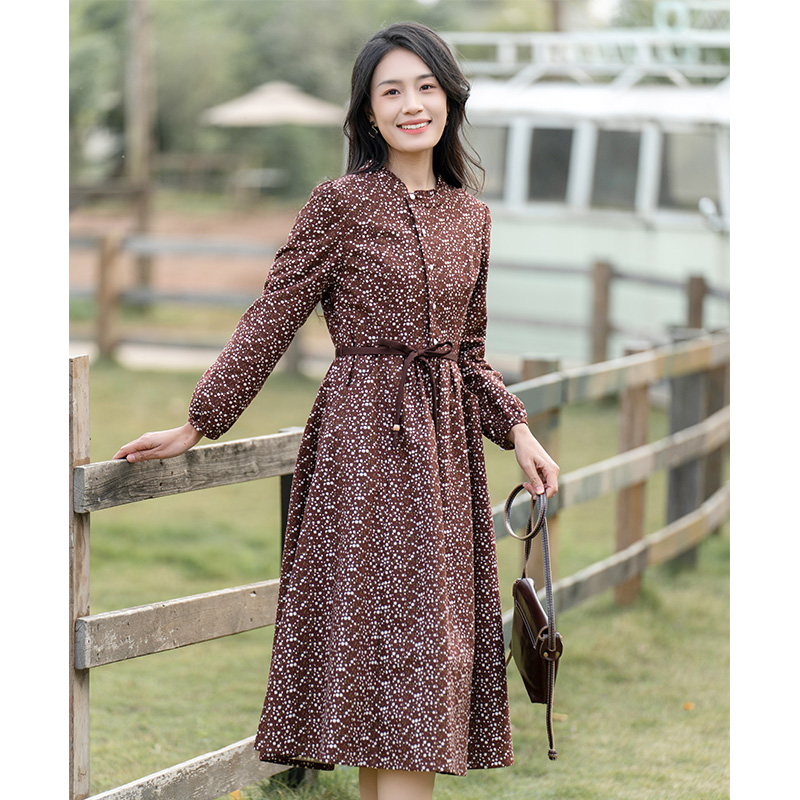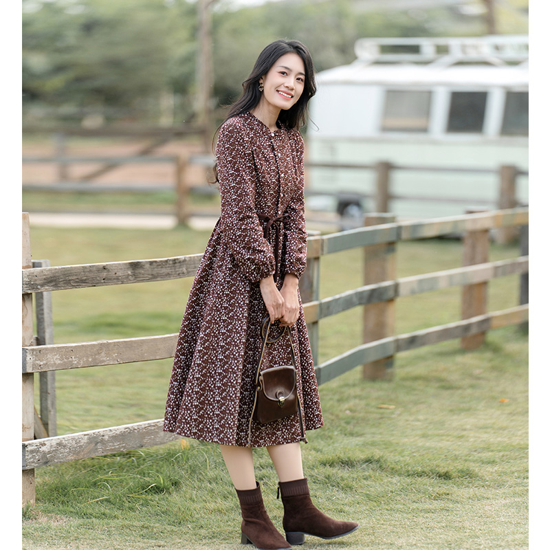 纻衣纯棉碎花长袖连衣裙女2025秋冬新款新中式小立领小众中长裙子