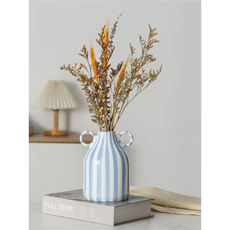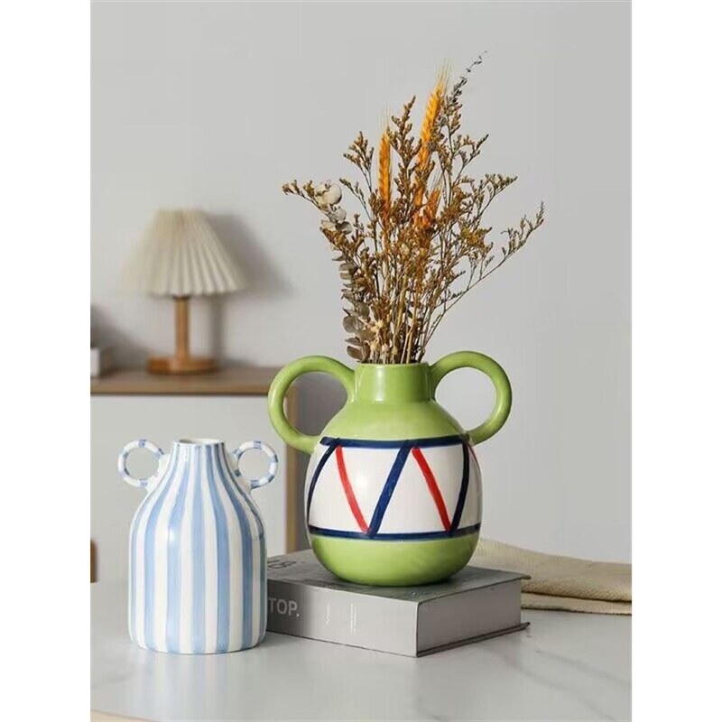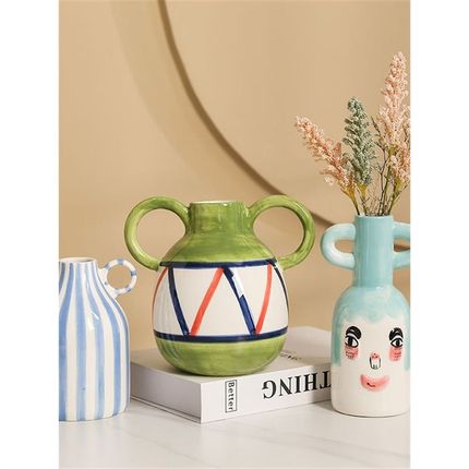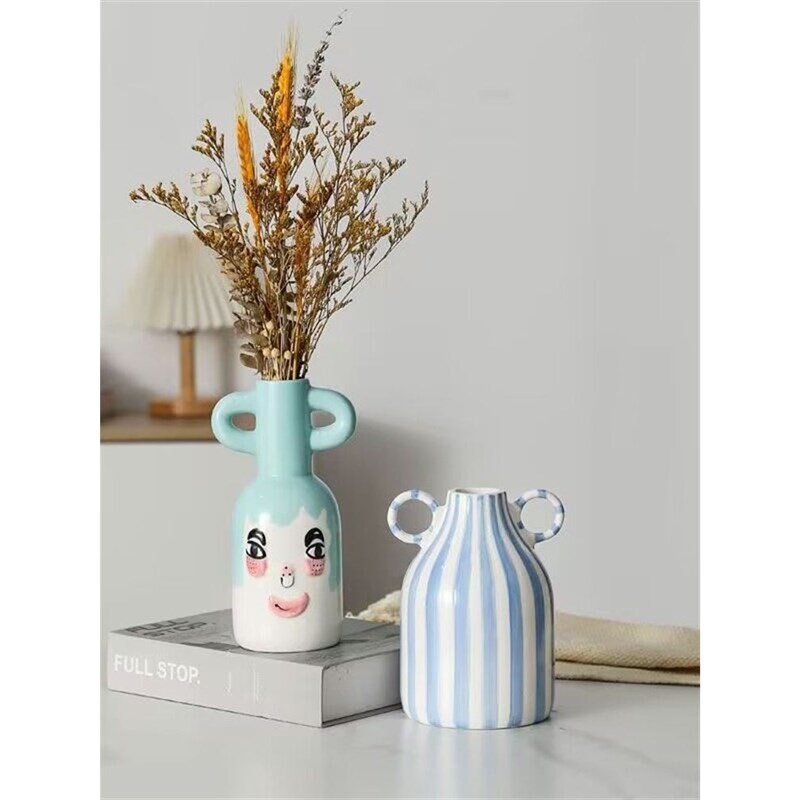 ins简约条纹双耳陶瓷花瓶笑脸可爱装饰摆件简约家居客厅创意陶罐
