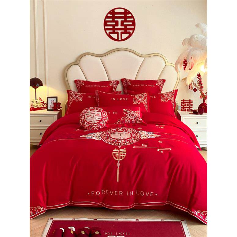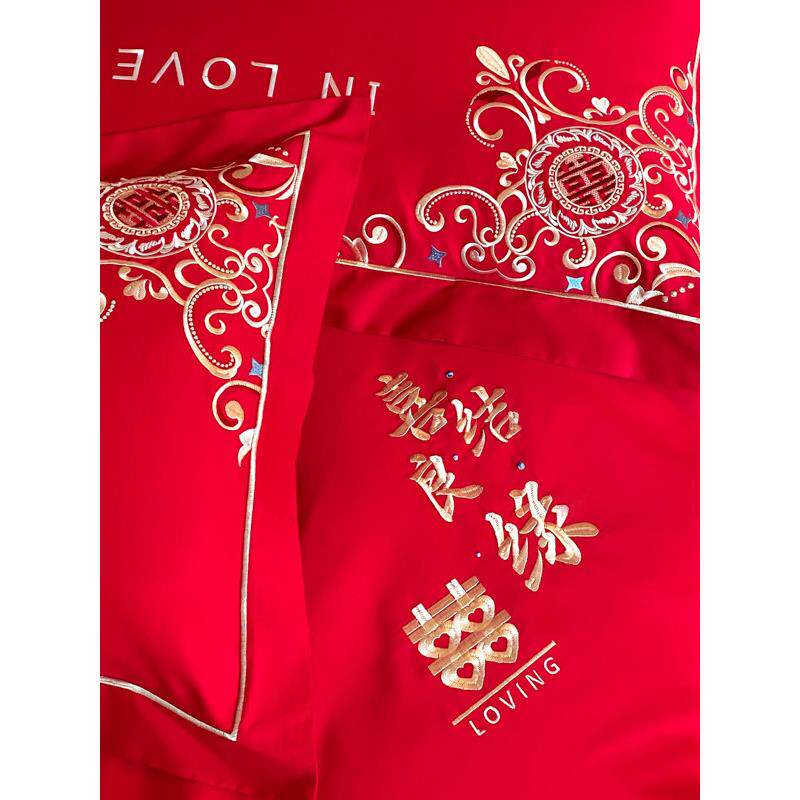 高档结婚床上四件套婚庆大红色被套新婚房喜被陪嫁被罩床单款床笠