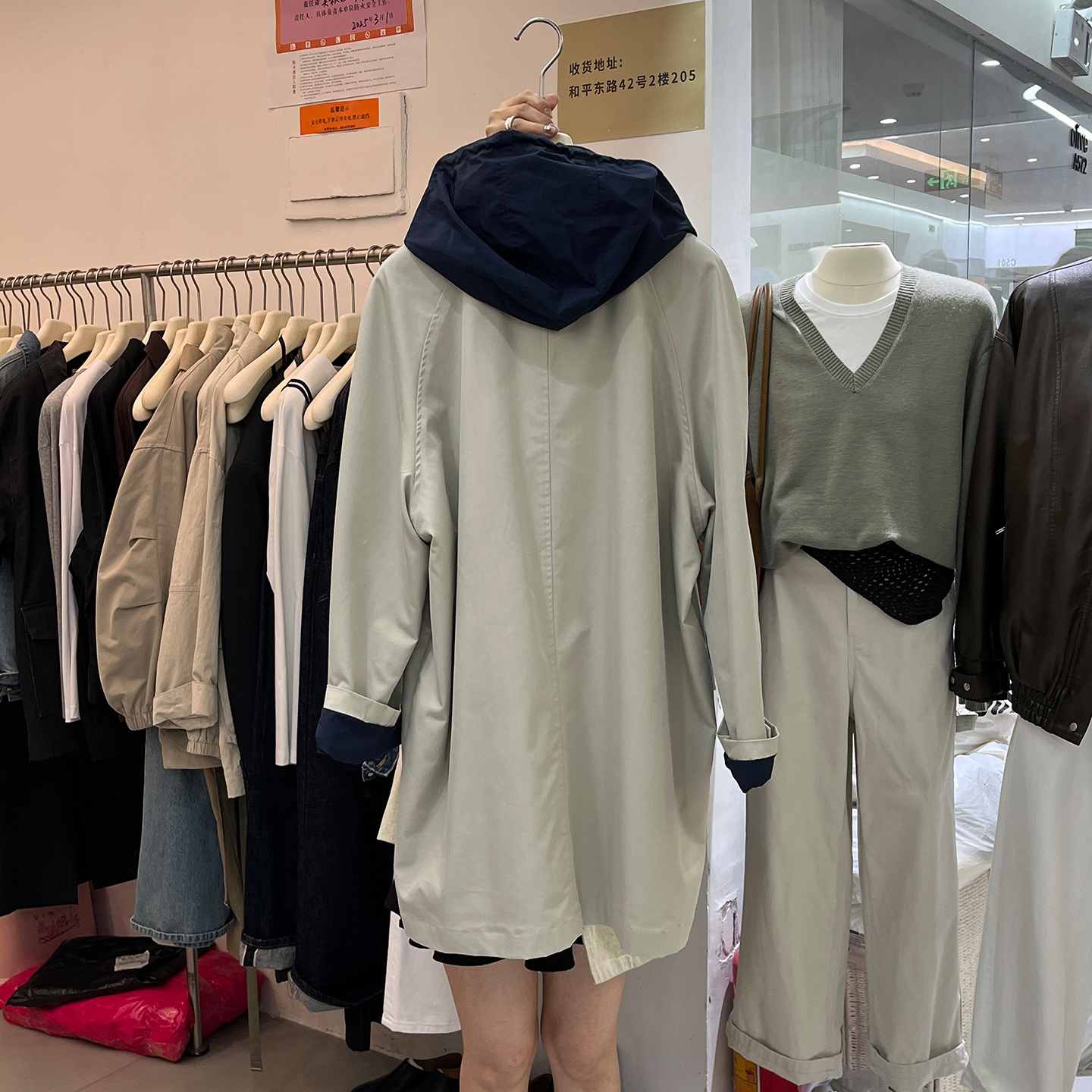 宽松长款撞色连帽风衣外套女