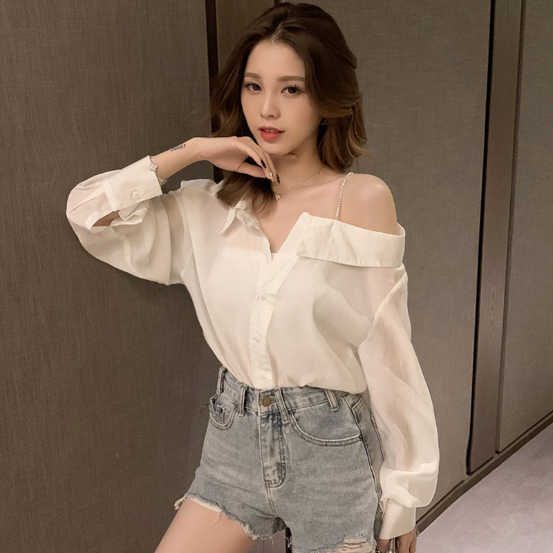 清仓秒杀~品牌折扣店专柜撤回女装露肩性感上衣长袖轻熟雪纺衬衫