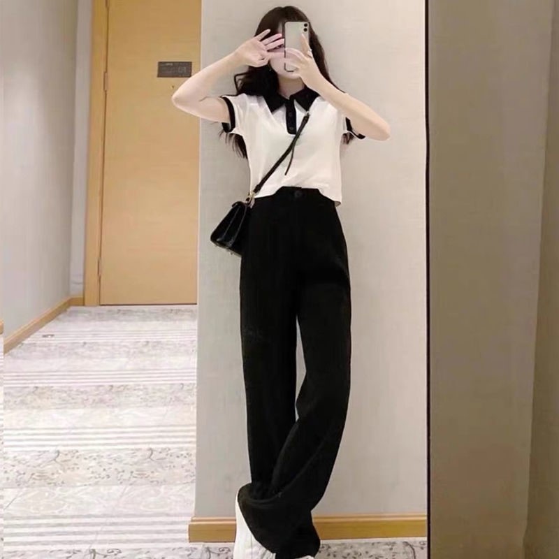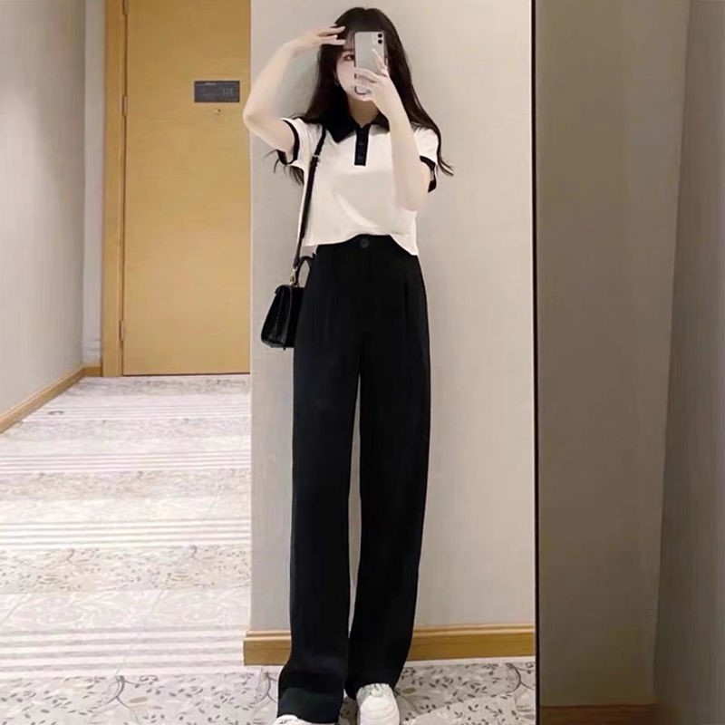 炸街休闲套装女夏季2025新款polo上衣T恤高腰阔腿裤长裤两件套潮