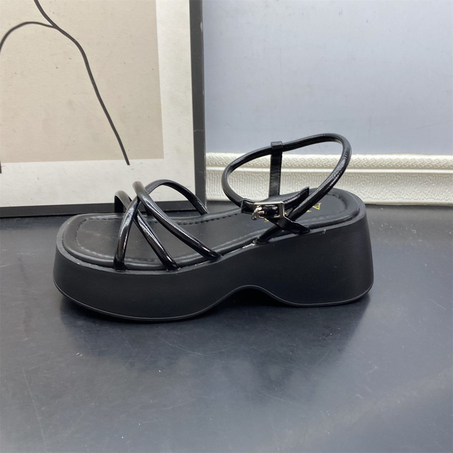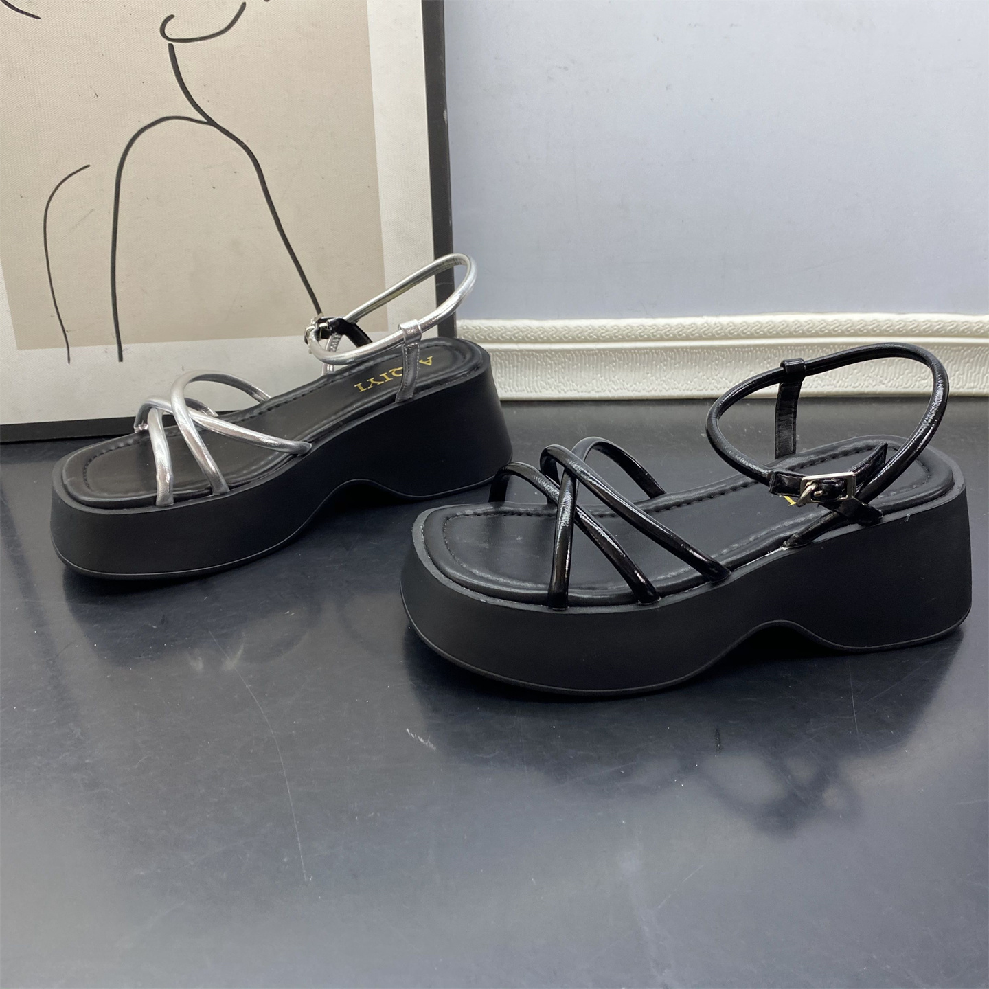 工厂处理2025夏季新款厚底松糕底交叉带露趾外穿一字沙滩凉鞋女
