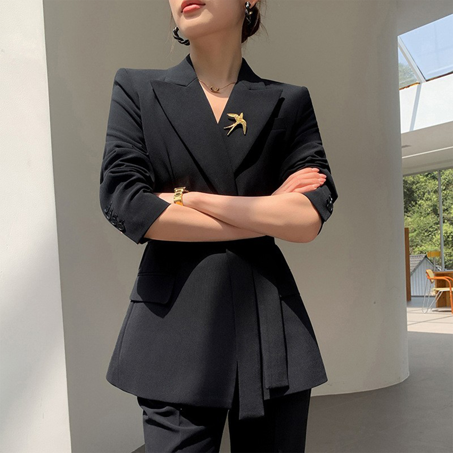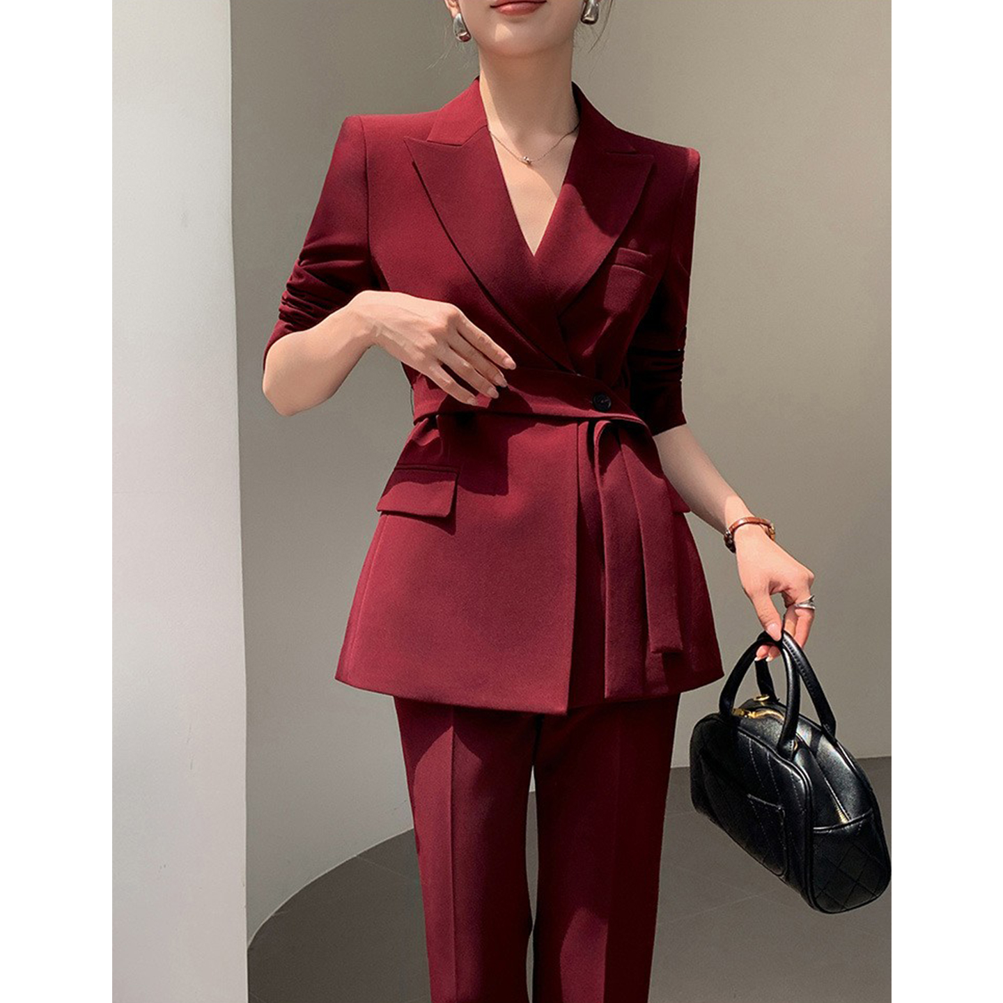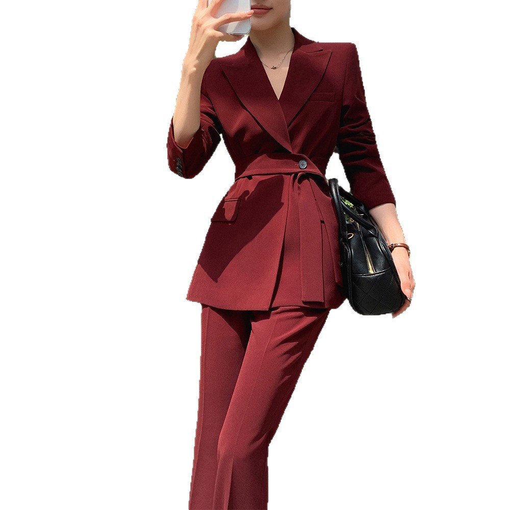 大码女装中长款职业休闲长袖系带收腰西装套装胖mm通勤西服长裤子