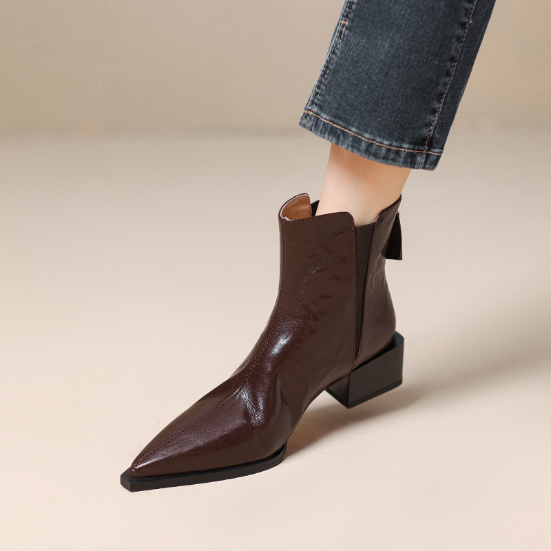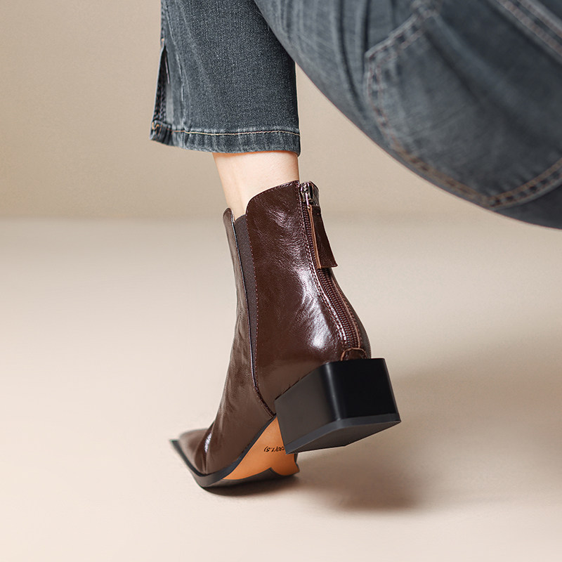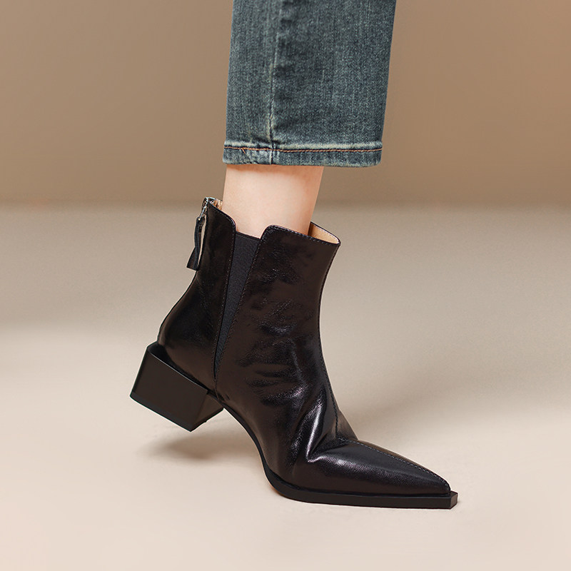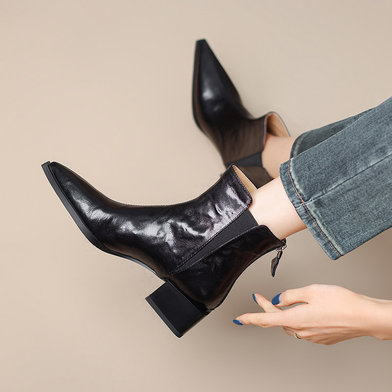 轻奢质感~复古法式真皮气质尖头中跟马丁靴女后拉链瘦瘦粗跟短靴