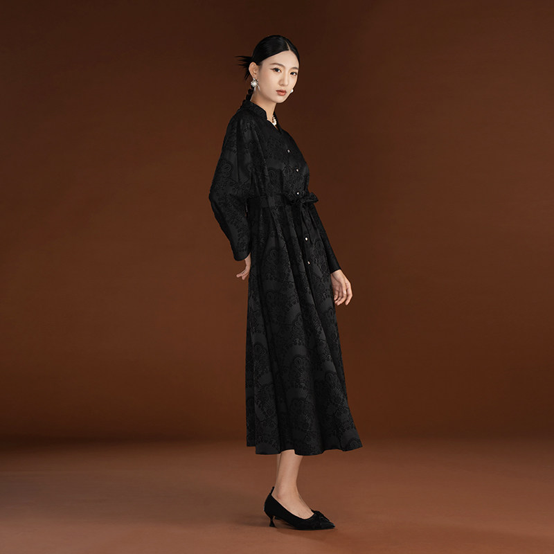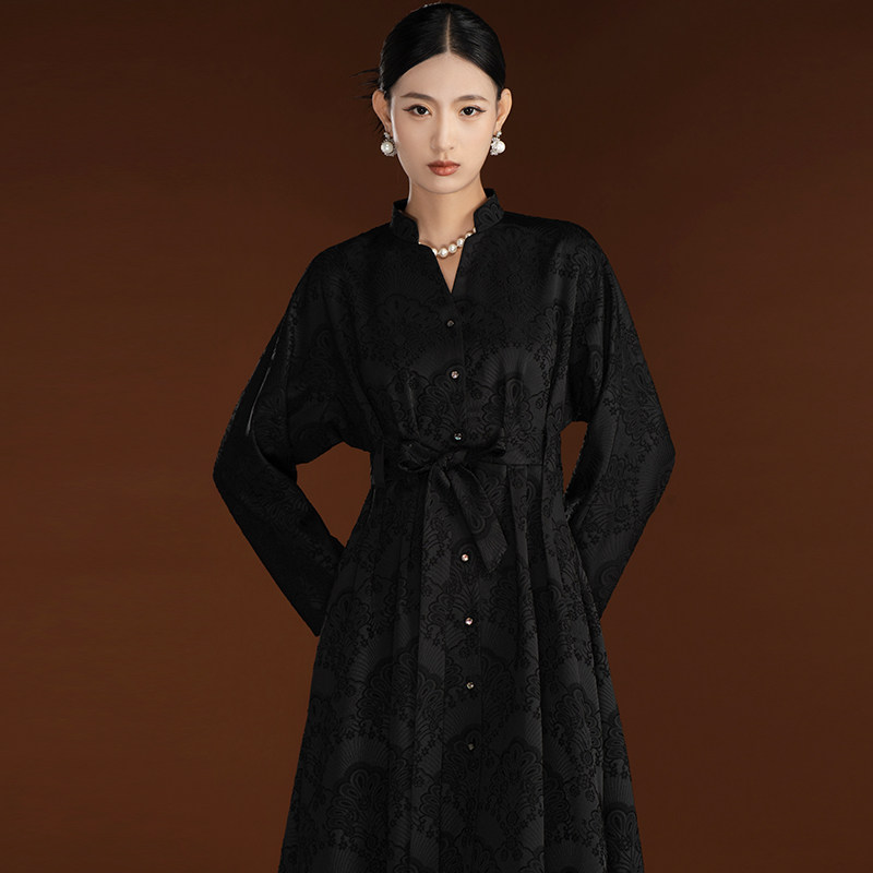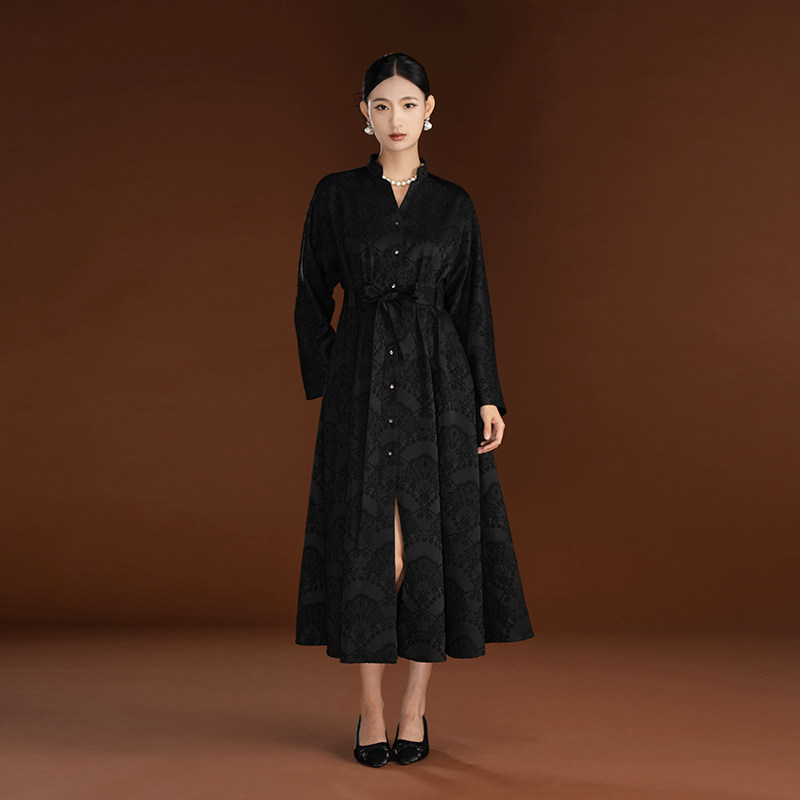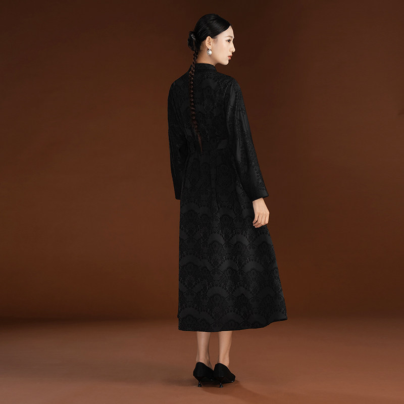吉祥衣家新中式国风新款修身高定女装长裙气质长袖连衣裙春秋款