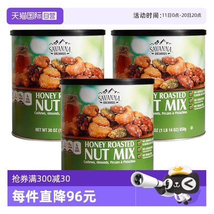 【自营】SAVANNA蜂蜜巴旦木混合坚果850g*3罐开心果果仁零食进口