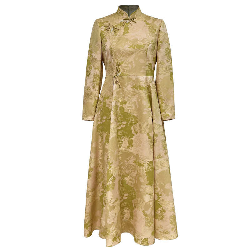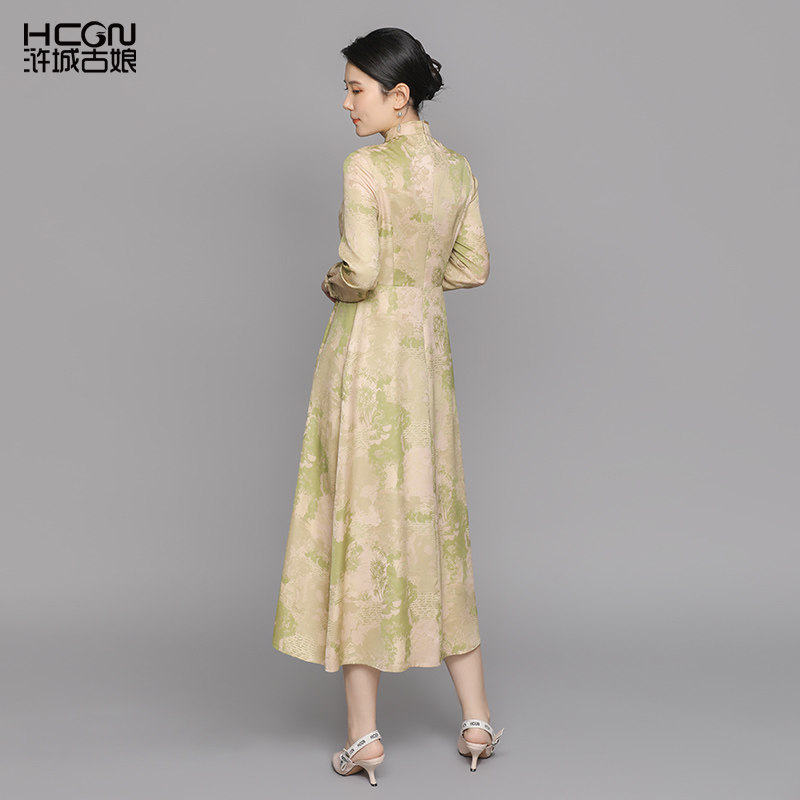 浒城古娘新款桑蚕丝印花气质立领长袖新中式国风旗袍连衣裙女春秋