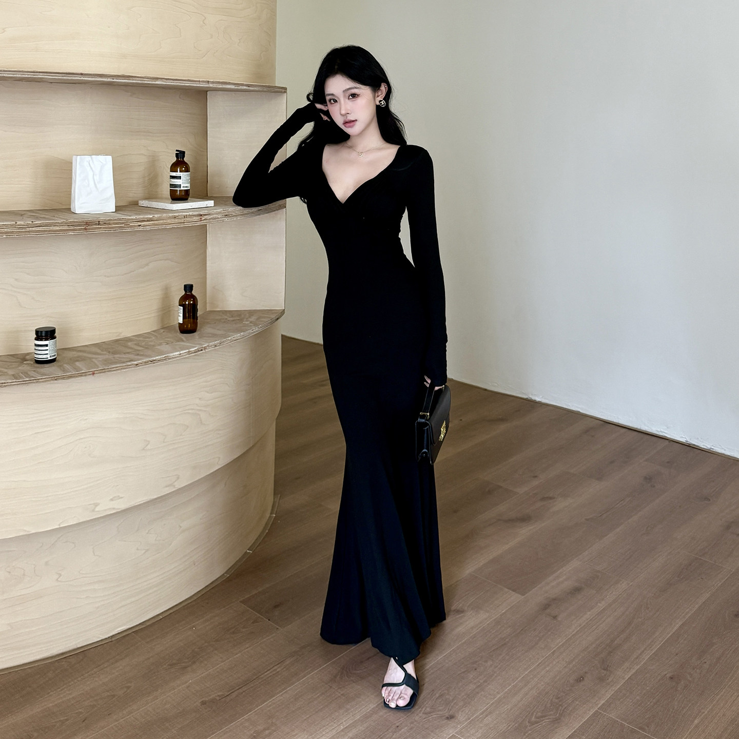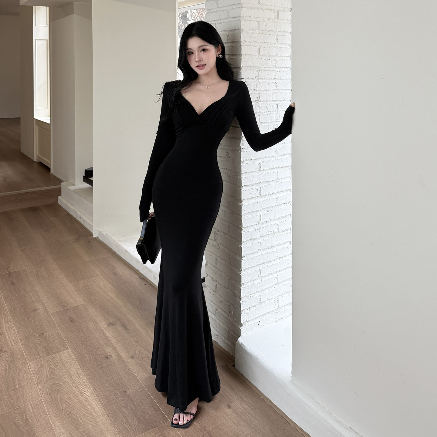 GirlsAt18 性感深V领长袖连衣裙女秋季新款气质修身包臀鱼尾长裙