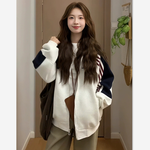 条纹美式复古撞色拉链外套女春秋薄款宽松慵懒风棒球服开衫卫衣潮